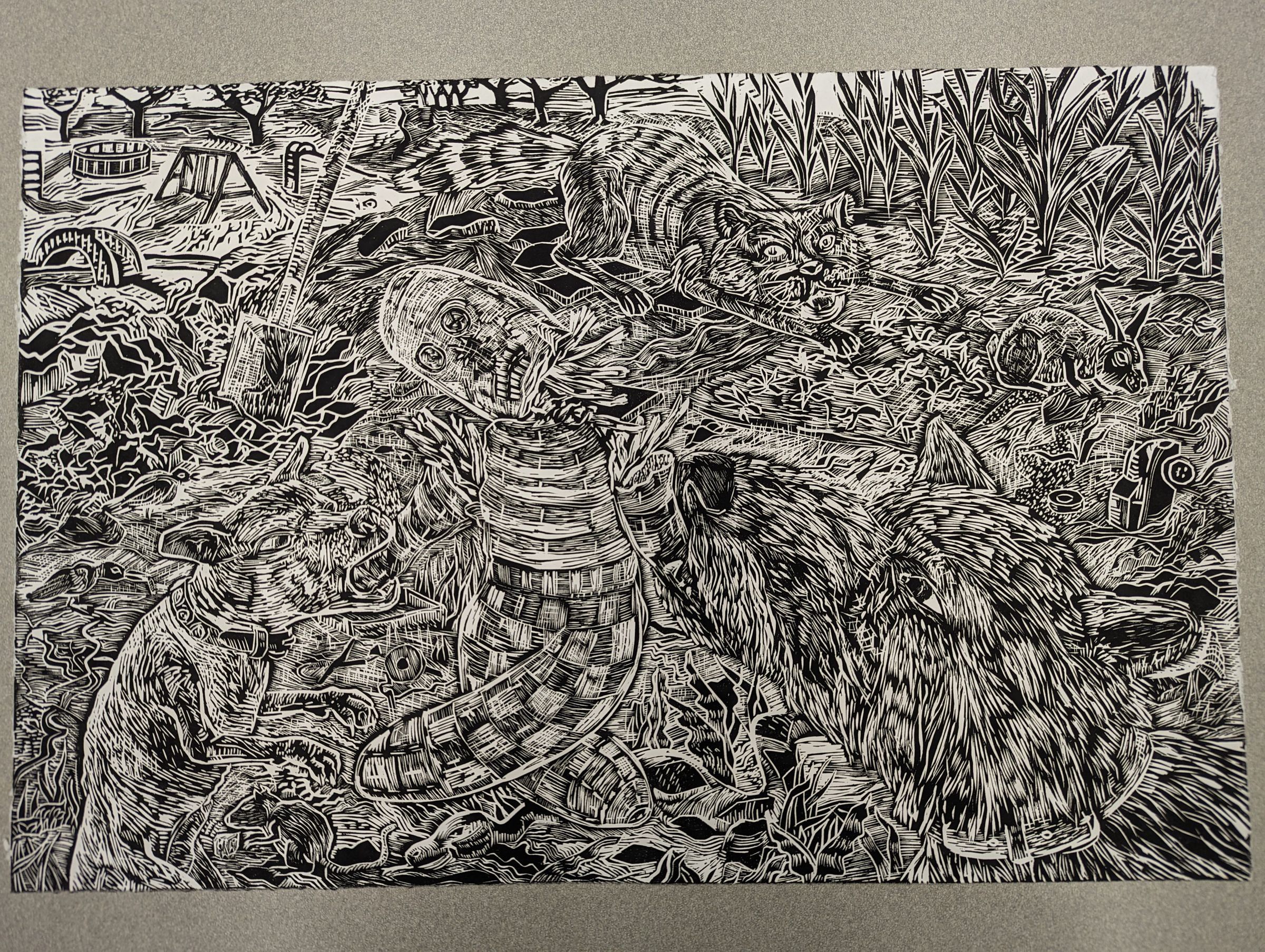 A large print, stylized such that the contours and edges of objects and figures are white lines subtracted out of black pigmentation. It depicts a scene of two dogs biting and ripping up a scarecrow-esque wicker figure, while behind them a cat hunts a rabbit. The background is made up of a field of corn on the right and a playground across a river on the left.Context