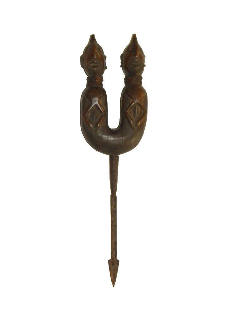 Carved wood double figures joined in a U-shaped and attached to an iron spikeCollection
