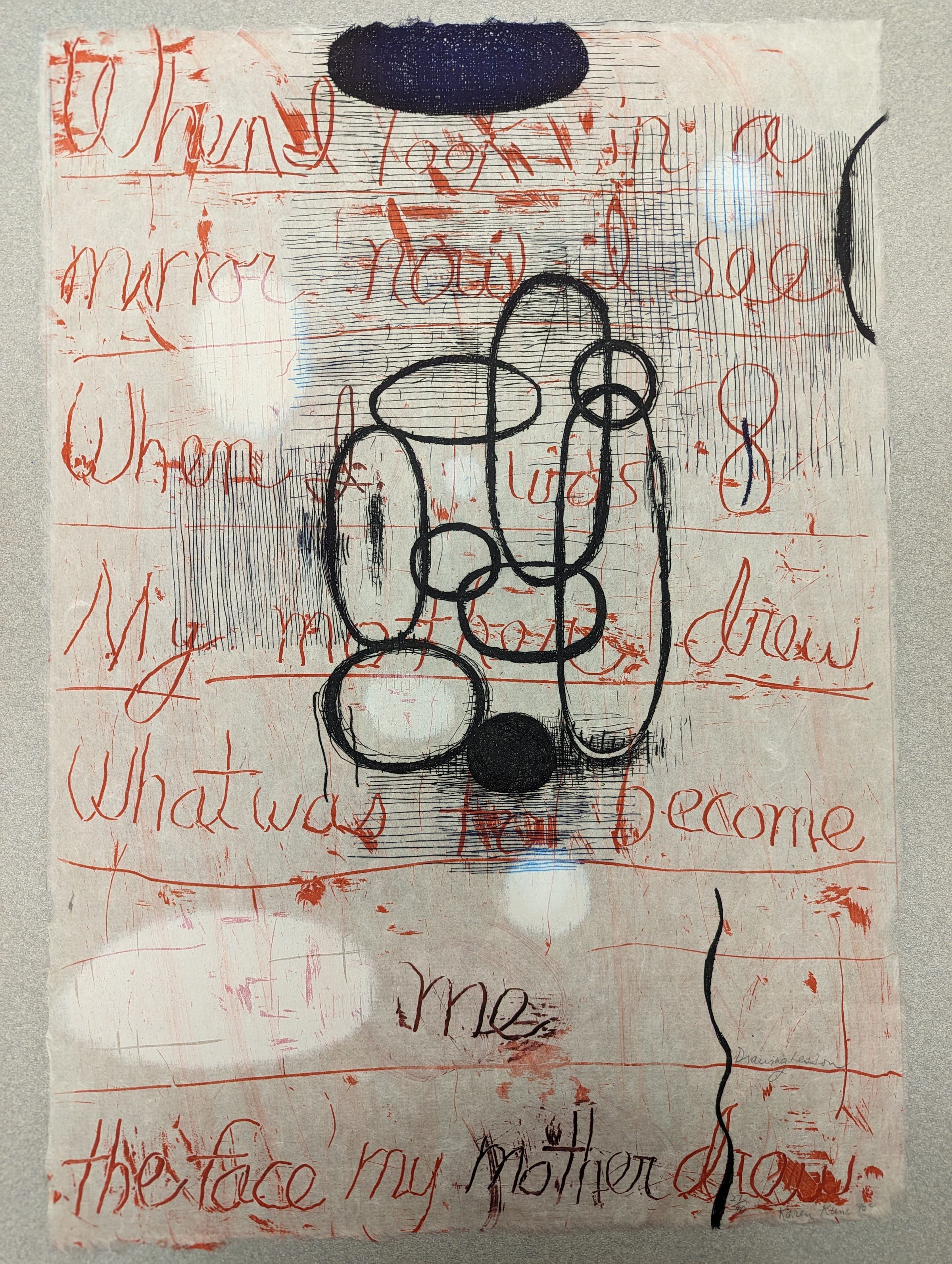 A large vertical print showing hatched lines and a central portion of overlapping circles and ovals. At the top and top right are other circular shapes. Going down the front in red pigment are the words "When I look in a / mirror now I see / When I was 8 / My mother drew / What was to become / me / the face my mother drew."Context