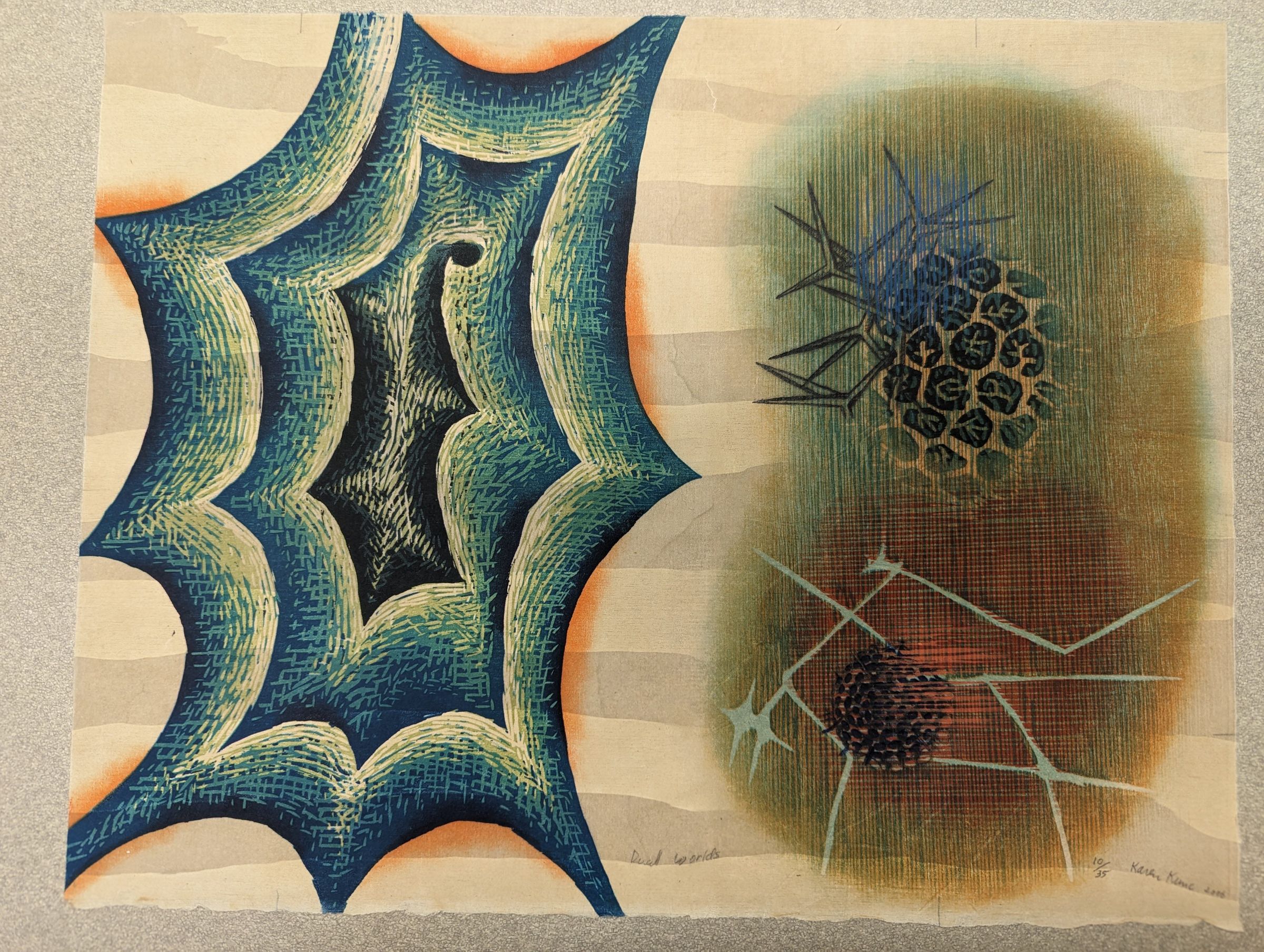 A print showing two formations, one on the left and right. The one on the left is a pointy and spiraling shape with gradients hatched into each level in blue, green, and white. The one on the right is green, fuzzy and ovoid, with sharp, brambly shapes sprouting from two ball-like clusters in its top and bottom halves.Context