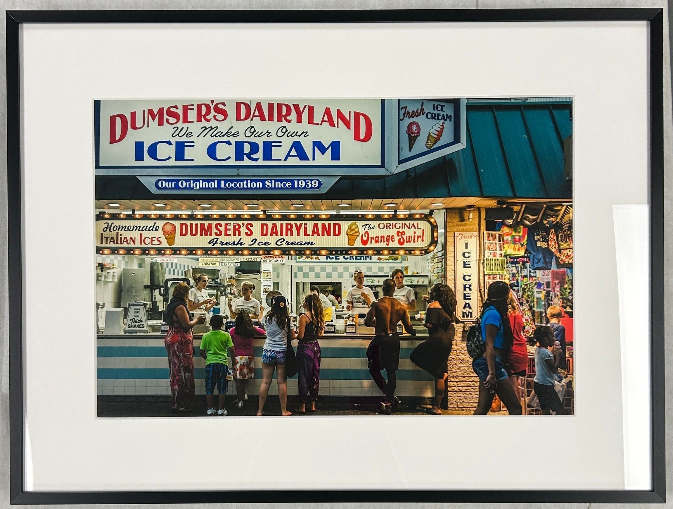 A large photograph of people outside a brightly lit ice cream shopCollection