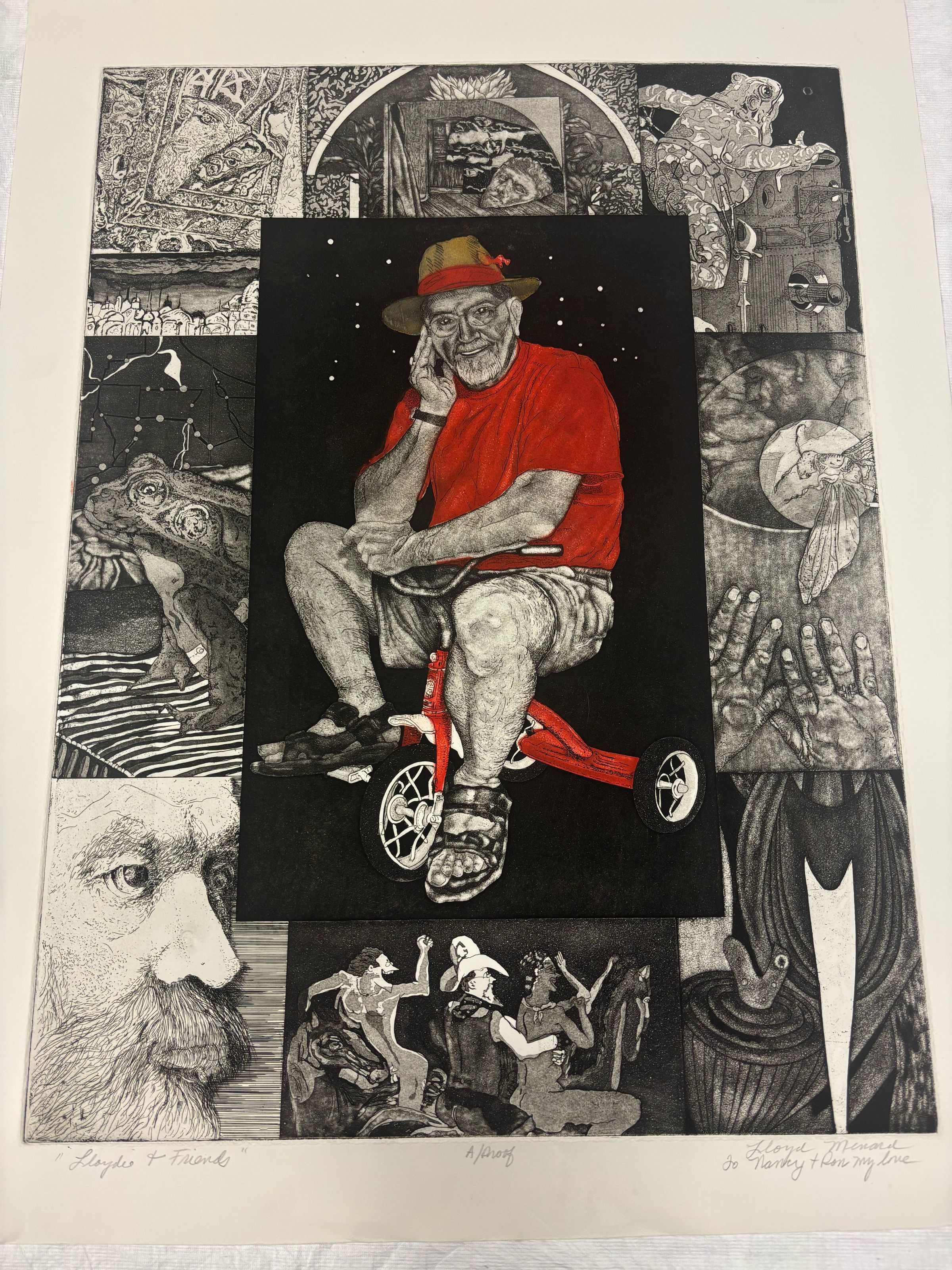 Large, rectangular, vertically-oriented print of a older gentleman wearing a red shirt and a hat sitting on a kids bike. Behind him is a collage of eight different prints mostly depicting animals and figures in a surreal setting.Collection