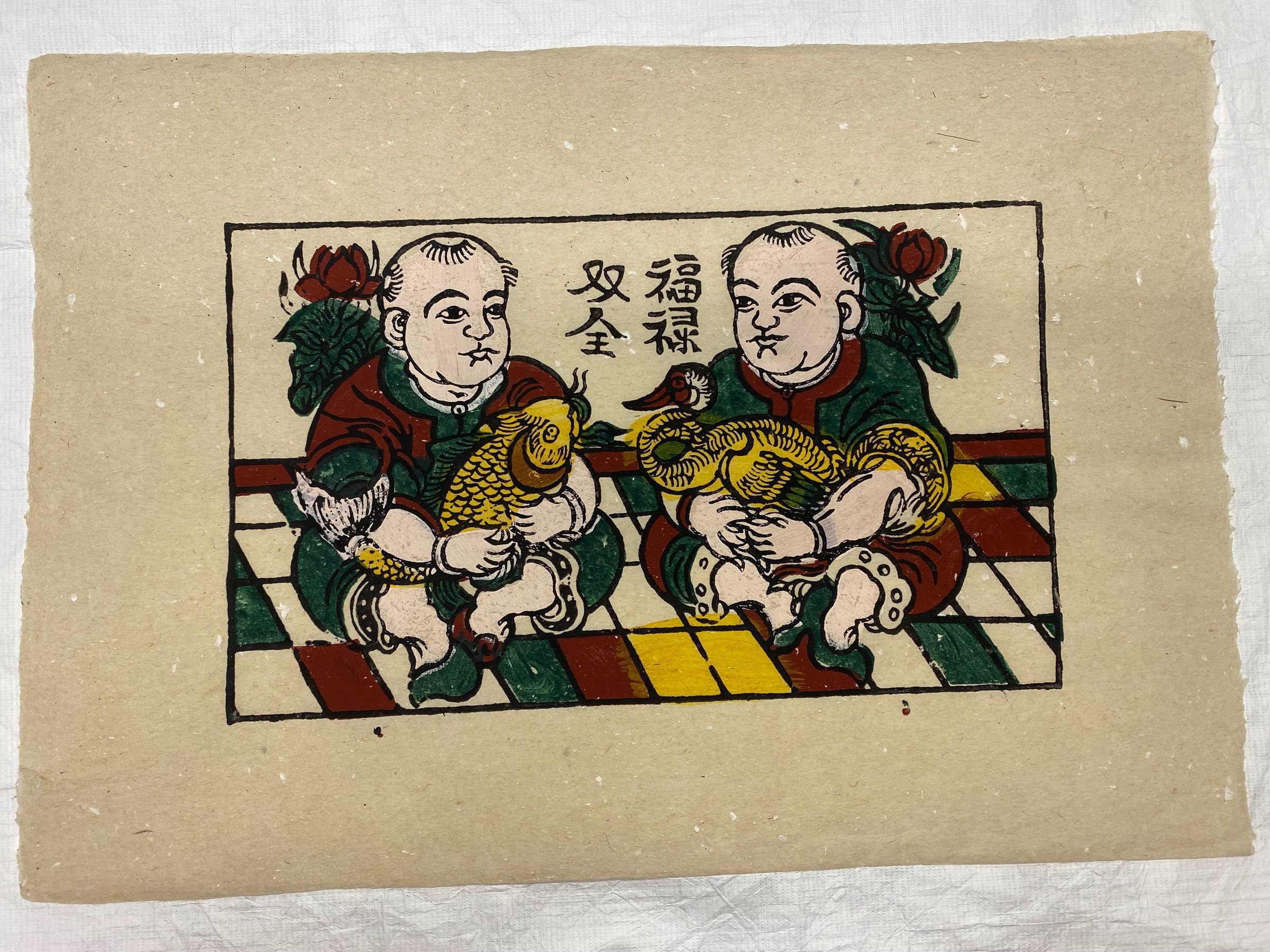 Traditional Vietnamese folk woodblock print on plant fibrous paper horizontally depicts two small male figures cross-legged sitting on a patterned floor looking at one another while holding animals. The one on the right holds a carp, and the other holds a goose, lotus flowers are behind them with Chữ Nôm characters between the two.Context