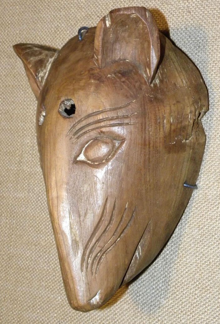 A life-sized triangular wood mask depicting a peanut-brown rat. Two carved almond-shaped eyes under three incised lines on the brow area. Two cutout eyeholes for the wearer are on the forehead. Two rounded ears protrude from the head. There are incised whiskers, nostrils, and a carved mouth at the end of a sharp nose. A wire is attached to the back of the mask. Some signs of scratching.Context