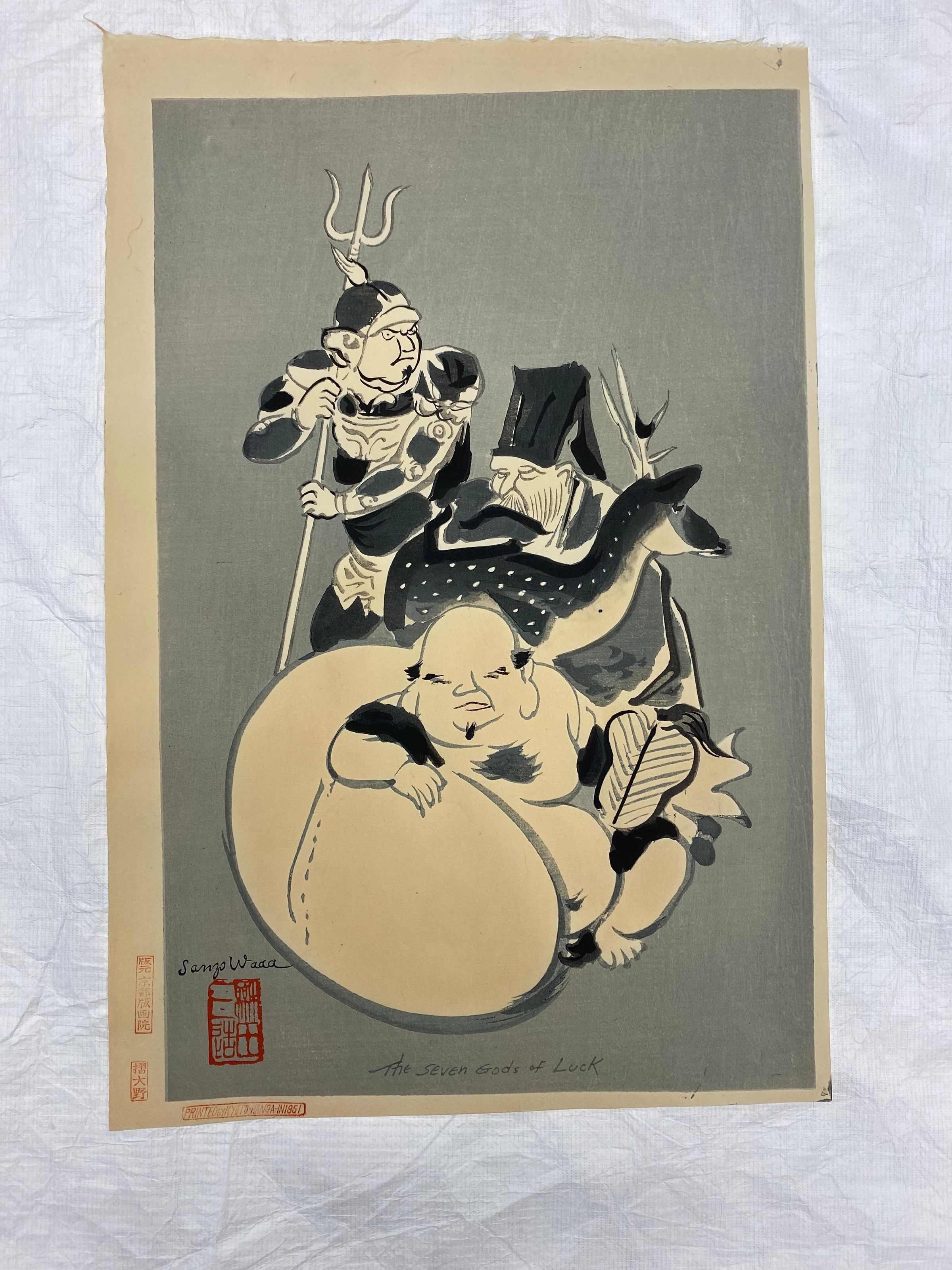 Vertically oriented black and gray woodblock print depicting three human figures, a seated large figure (Hotei ) in the foreground with its arm resting on a large bag and holding a fan in the other hand, an elderly figure in the middle ground with a deer (Jurojin), and a warrior figure holding a trident-like weapon (Bishamonten) against a gray background.Context