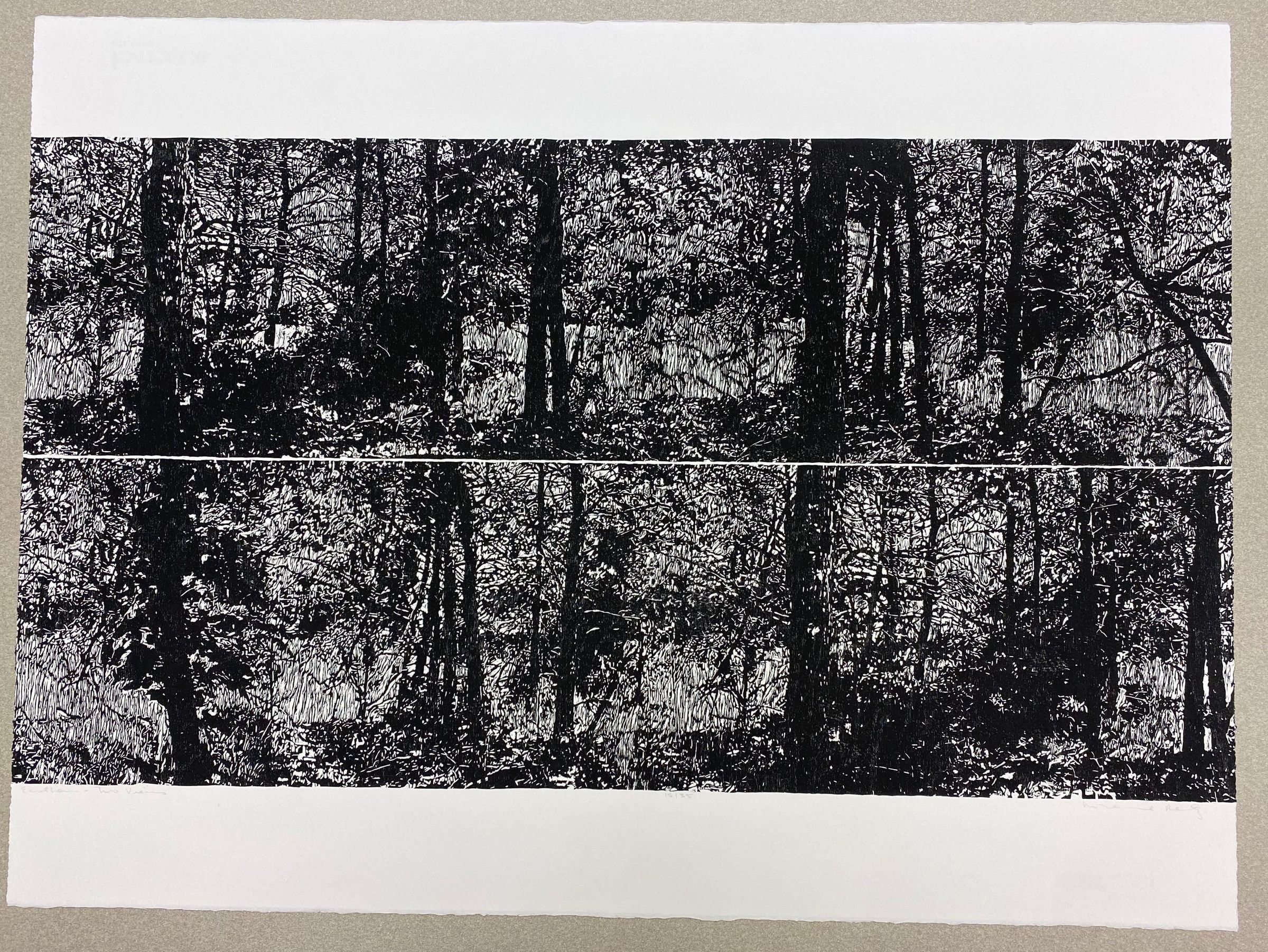 A large horizontally-oriented print of a forest done in black and white with two perspectives stacked on top of each other. Anything nature such as trees, grass, branches and twigs are black, while highlights, sunlight, and negative space are white.Edition