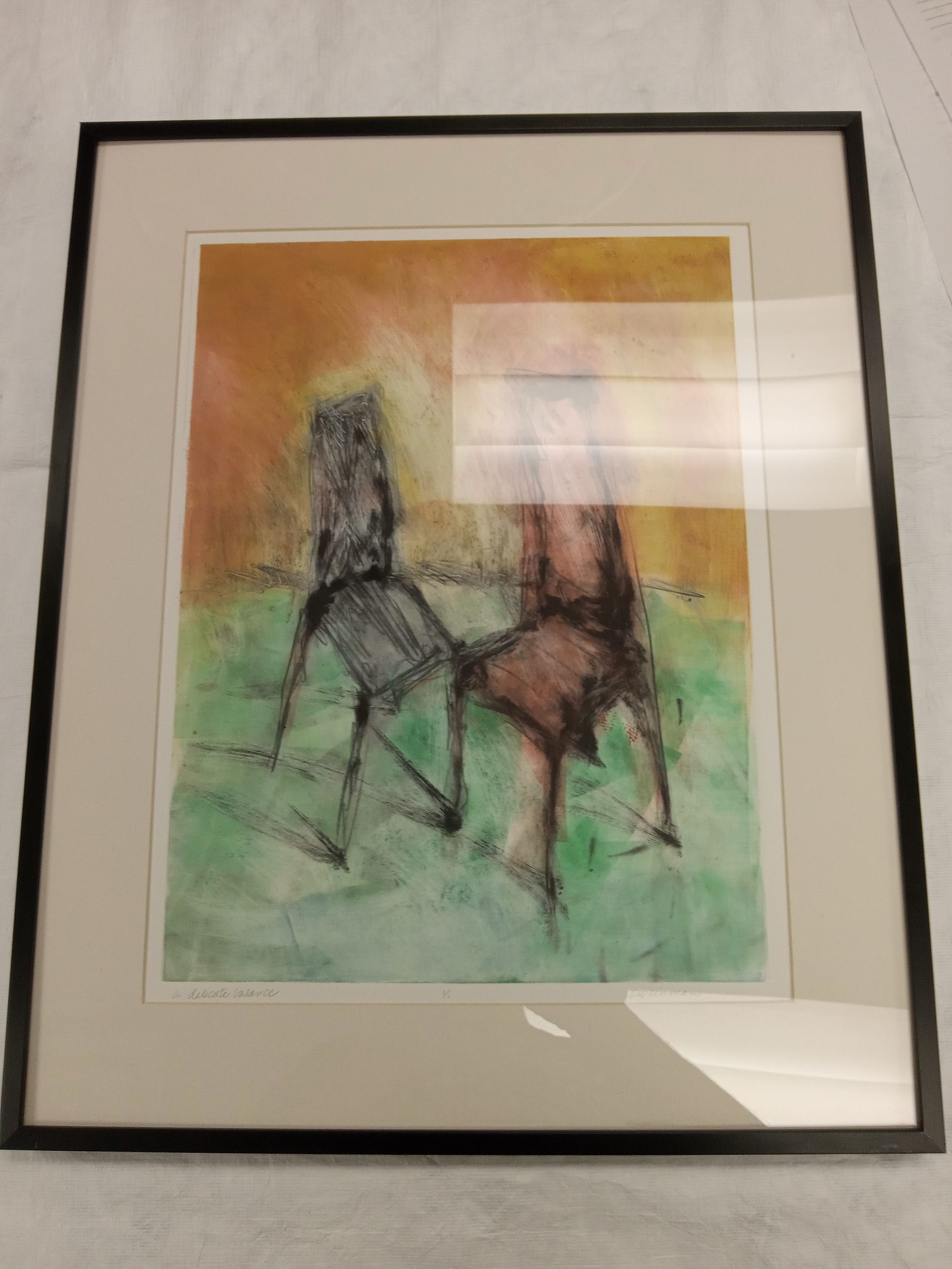 A medium sized image depicting two chairs in an open space with sketch-like pigment work.Collection