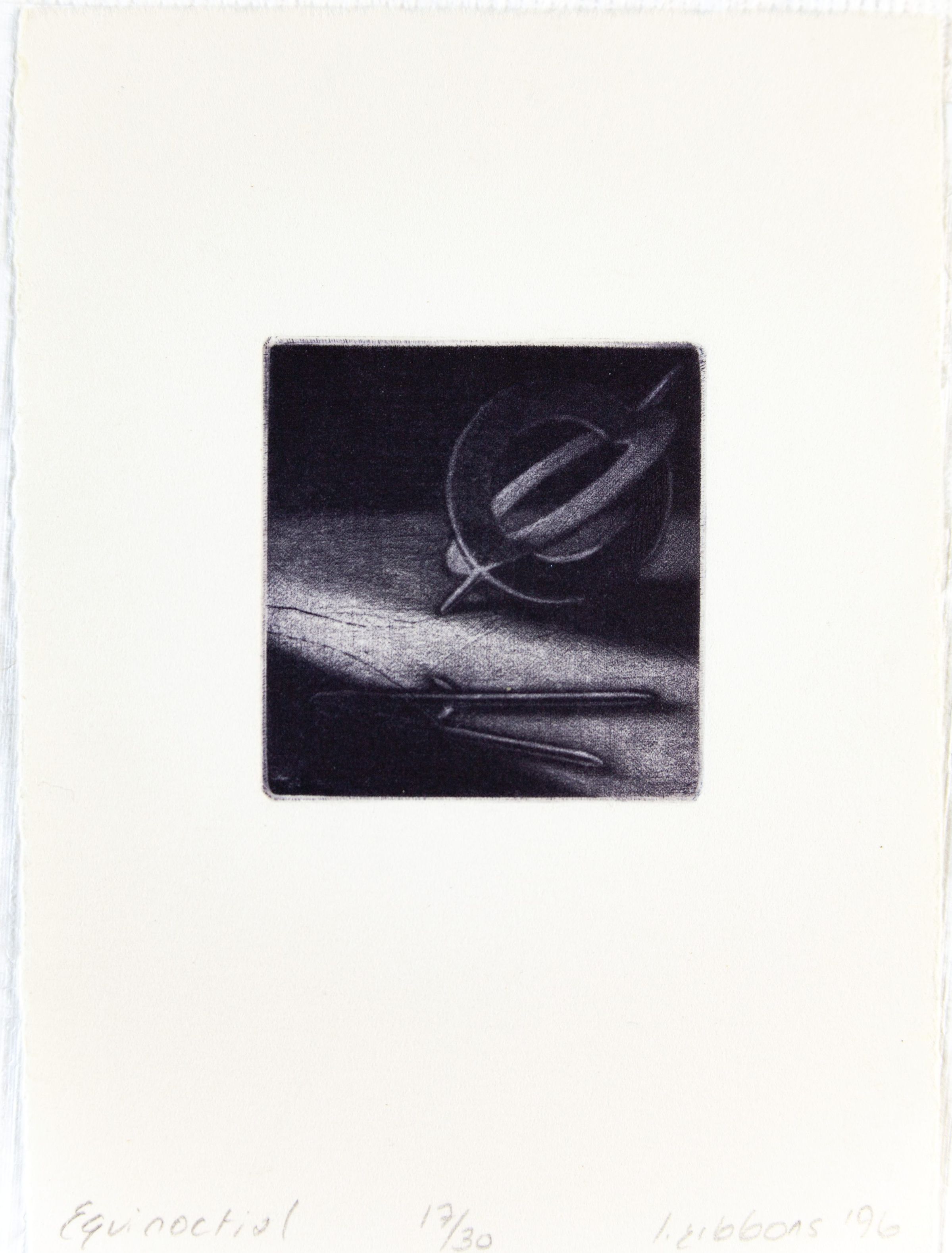 Small vertically oriented monochrome print depicting three dimensional astronomy mapping tools with light cast upon them against dark background.Collection