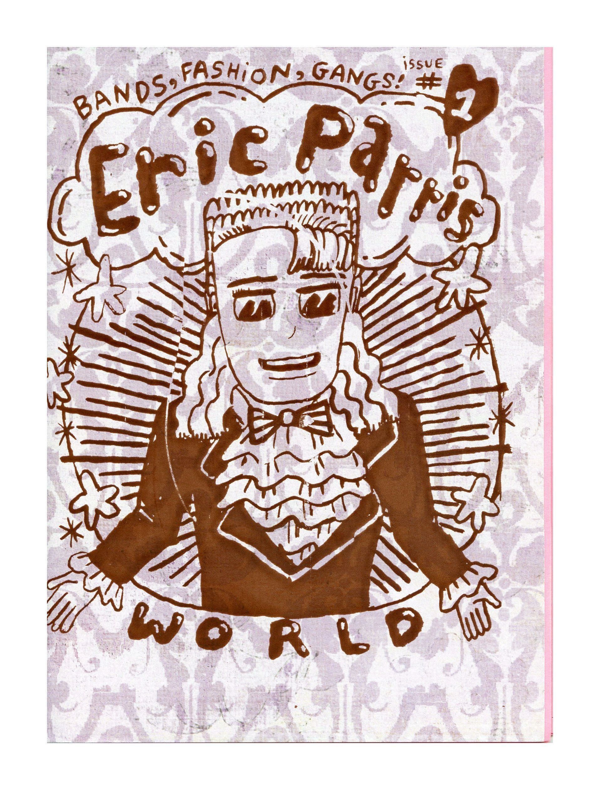 The booklet's covers have a lavender pattern with maroon text and images. The front cover has a guy with a mullet wearing a tuxedo and the back cover has a heart in a circle with the authors name and date of publication. The interior pages are neon pink.Collection