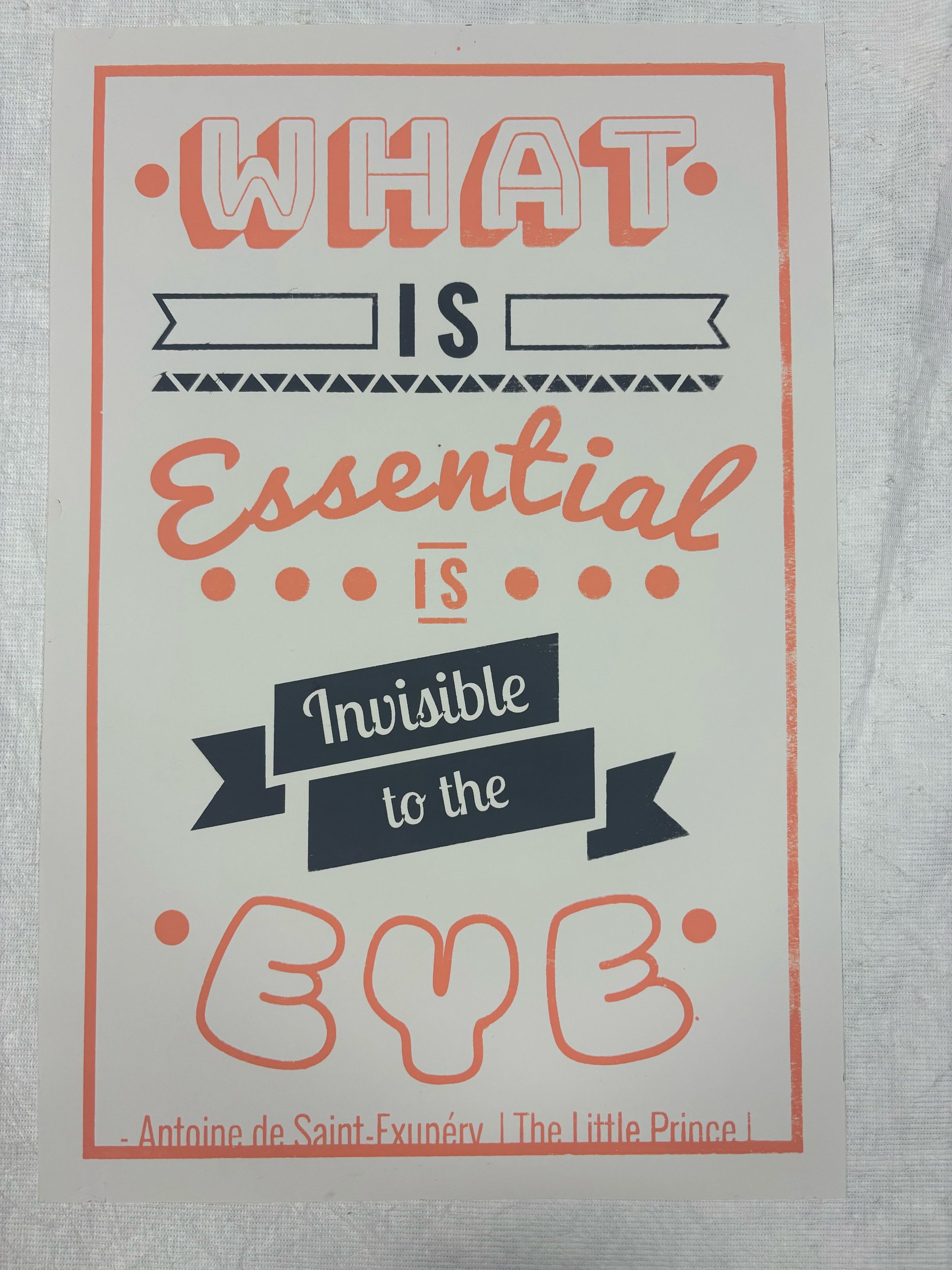 Medium, rectangular, vertically-oriented print with the quote "What is Essential is Invisible to the Eye" from the Little Prince. The graphic design features different font types and uses dots and triangles to frame the composition. The color palette is orange and navy blue.Collection