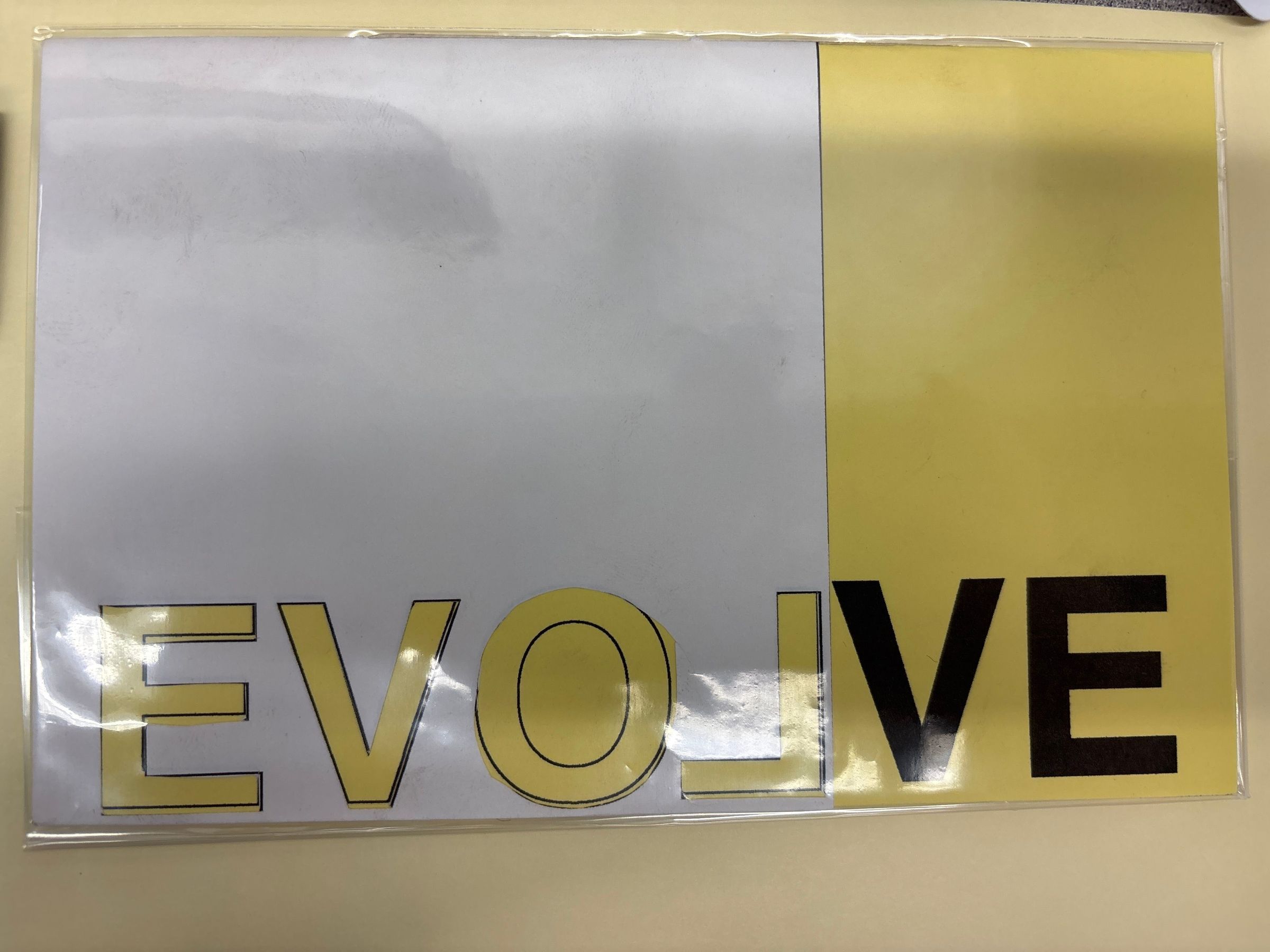 The cover is black, white, and yellow and features the word evolve that is presented with the last two letters (VE) in black and the rest in yellow. The L is backwards making the viewer to see the word love in evolve. The interior pages feature black and white images on white paper along with sentences and phrases.Collection