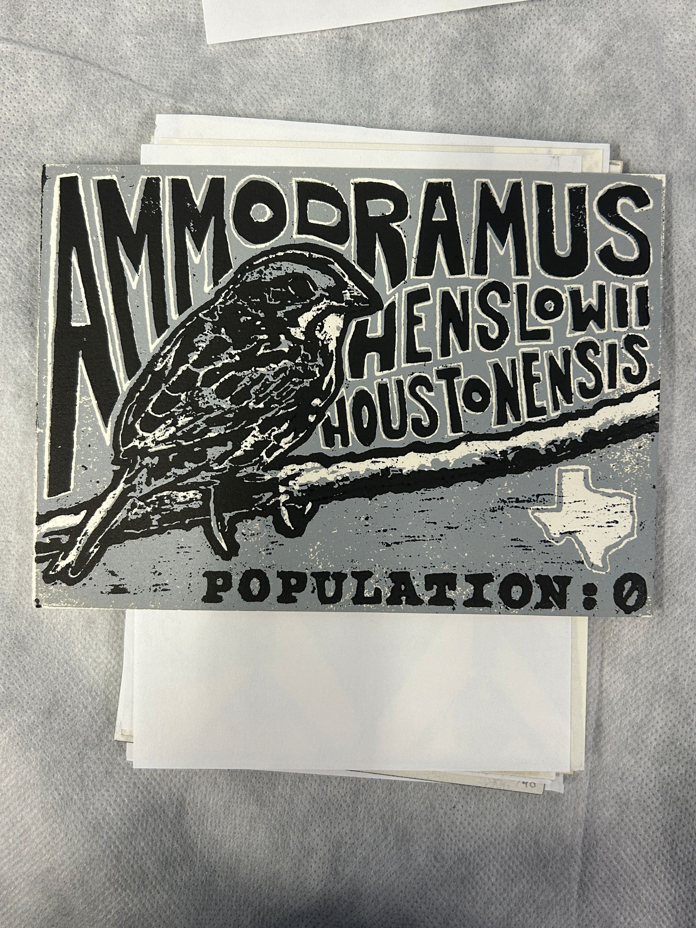A small black, white, and gray print of a bird on a branch with text in the backgroundCollection