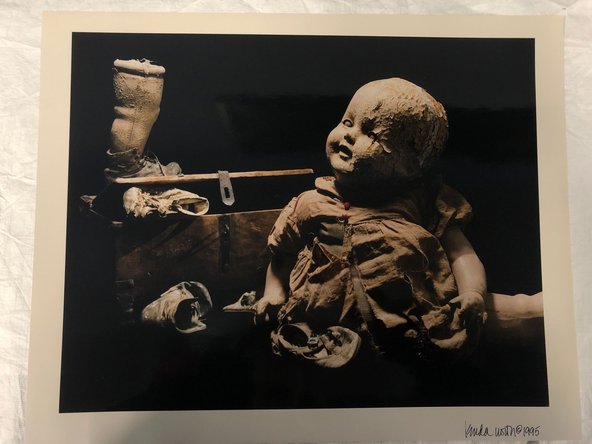 Large photograph on glossy paper, depicting a worn, cracking baby doll to the right of the piece, shoes strewn in front, and a trunk to the right with clothes hanging out of it, bodyless leg placed on its lid.Collection