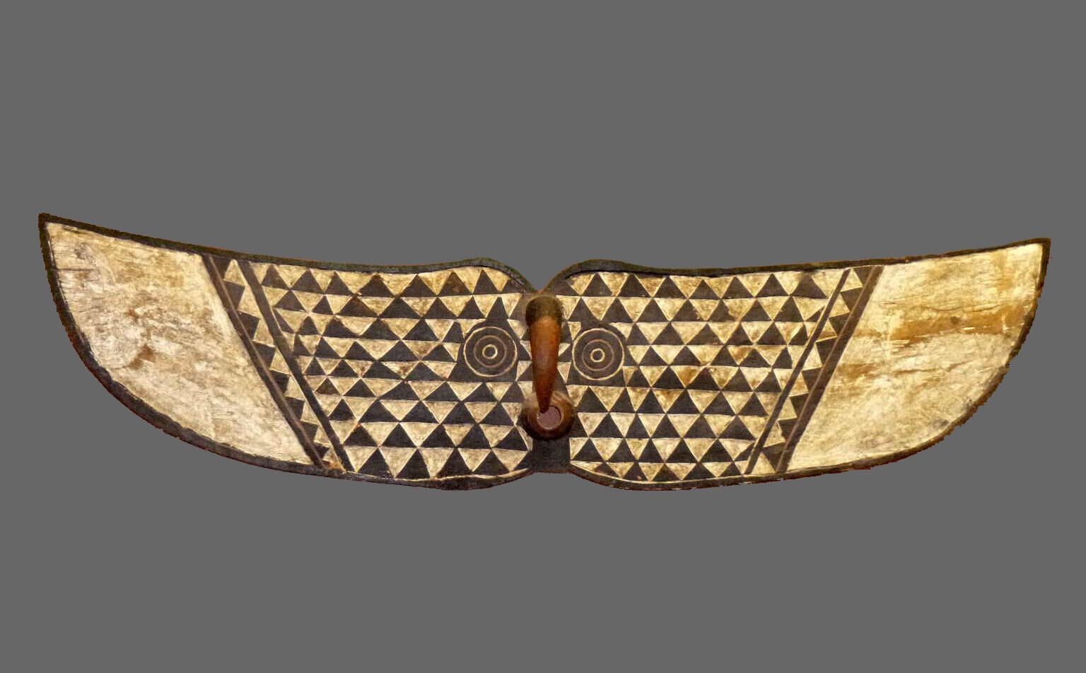 Large horizontal plank mask depicting a hawk, with black and white geometric pigment decoration.Collection