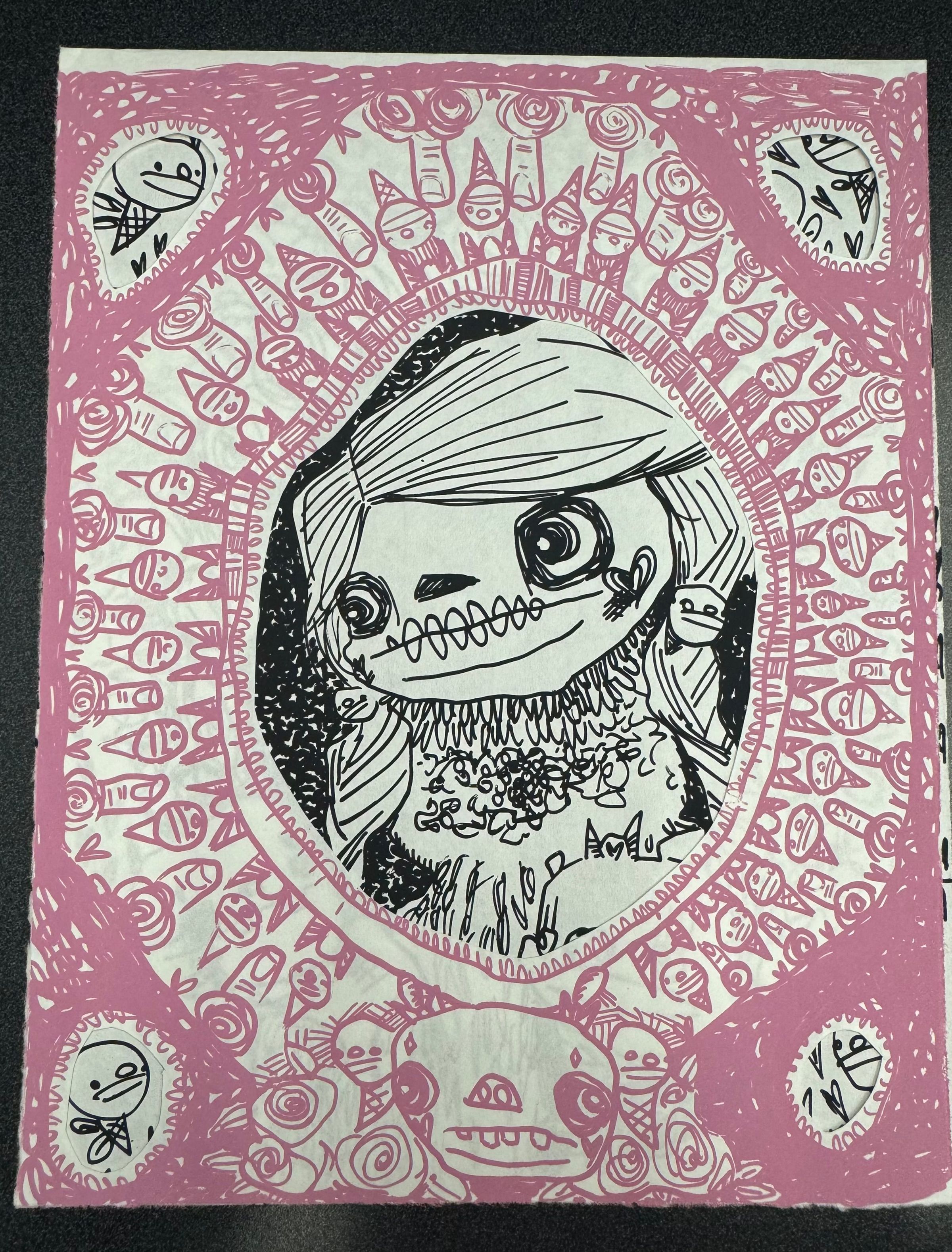 Small vertical rectangular multilayered print. The first layer is rose pink and has five cutout ovals to show the black and white second layer. There is a central skeleton figure surrounded by smaller skeletons, roses, ice creams, fingers, and bows. The backside is blank except for the artist's signature.