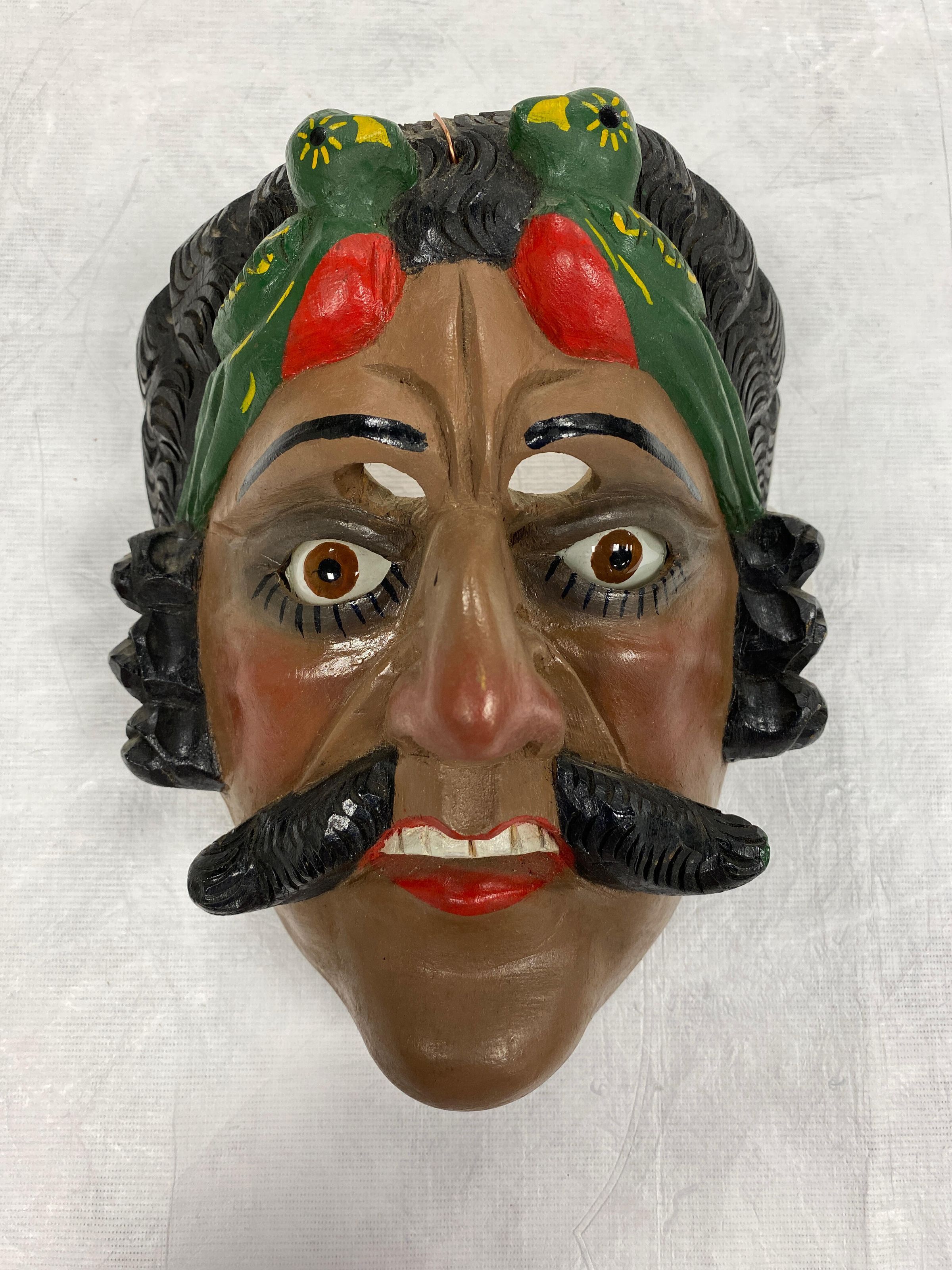 A life-sized diamond face-shaped wood mask depicting a man with a chestnut brown complexion and blush accents on cheeks and nose. The mask has curly black carved hair that leads into sideburns. The hair is decorated with two green birds. There are two inset glass light brown eyes with black eyelashes beneath and dark brown shading around the eyes. The cutout eyeholes for the wearer are under black eyebrows. The mouth is parted with red lips and white teeth. A parted black mustache is under a hooked nose. Incised lines on the forehead and mouth depict wrinkles. A copper wire is attached to the back of the mask. The mask is in excellent condition.Context
