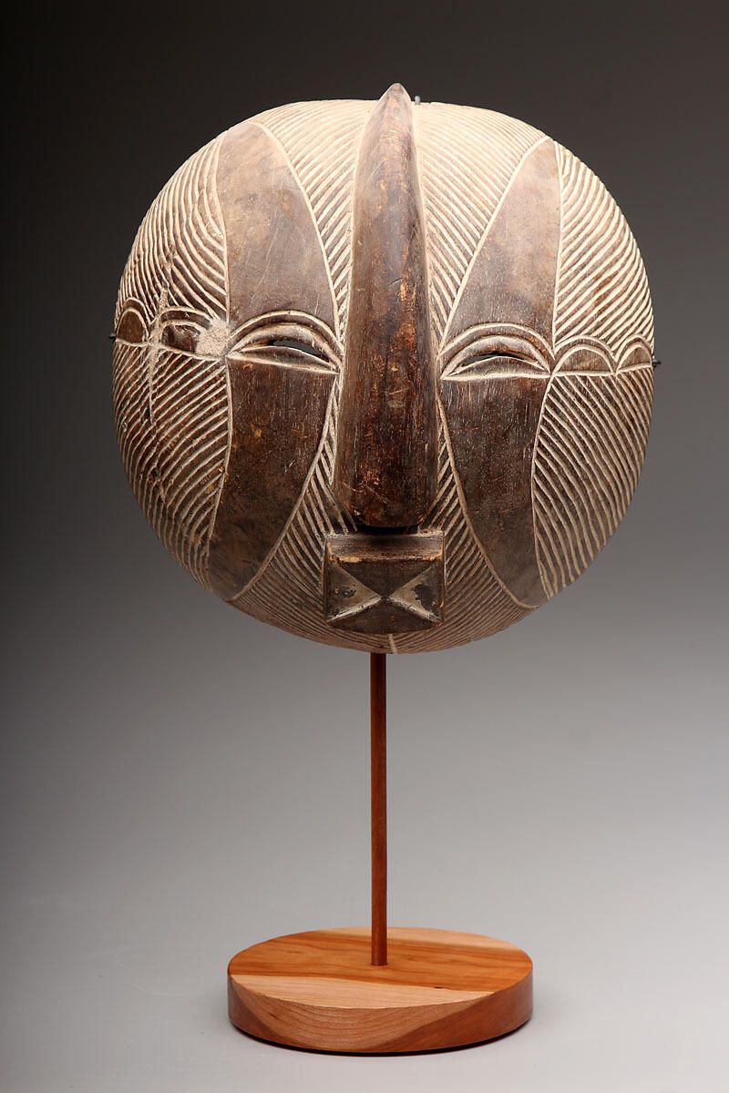 Medium round face mask with large geometric features, repeating eye-like motifs connected to the eyes, and pigmented incised lines covering the mask.Collection