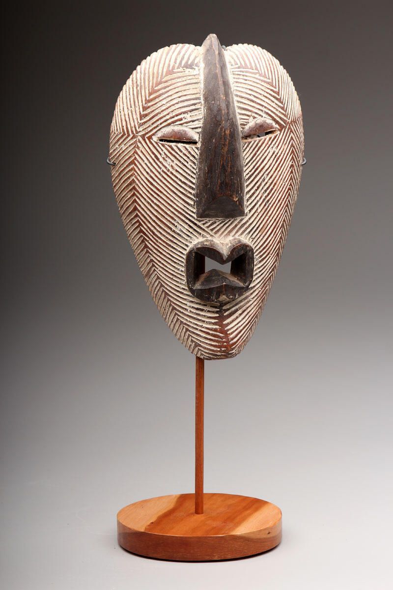 Medium carved wood face mask with white striations and black geometric features.Collection