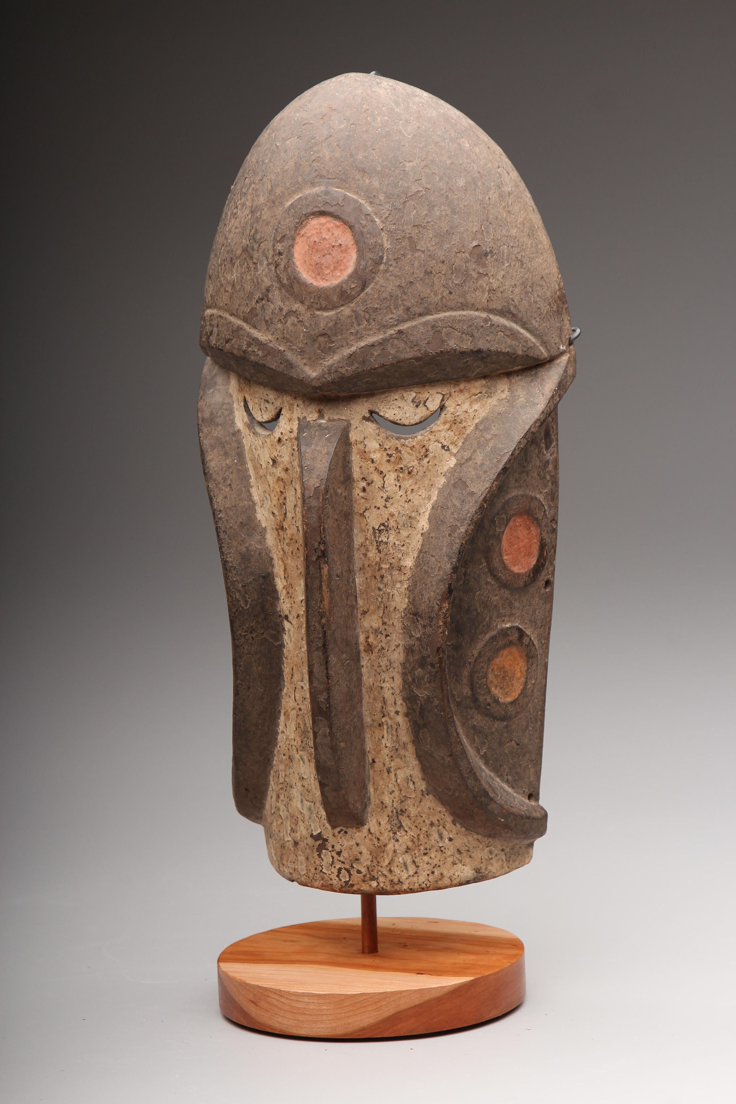 Medium carved wood face mask in the shape of a brown and white monkey head with red circles decorating it.Collection
