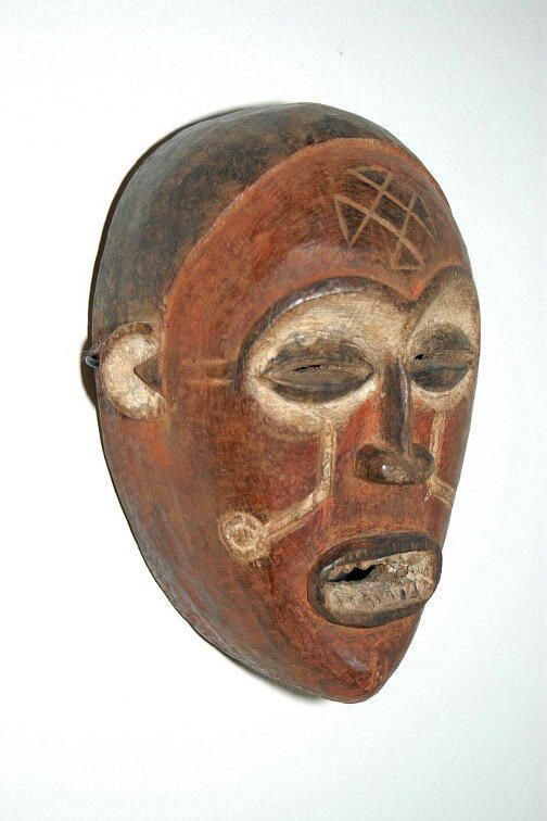 Carved pigmented wood face mask with slit eyes, protruding mouth and teeth, and incised design depicting scarificationContext