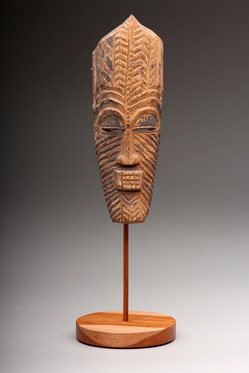Carved wood face mask with diagonal striations on face, rectangular mouth and teeth, slit eyes, and pointed, crown-like decoration on head.Collection