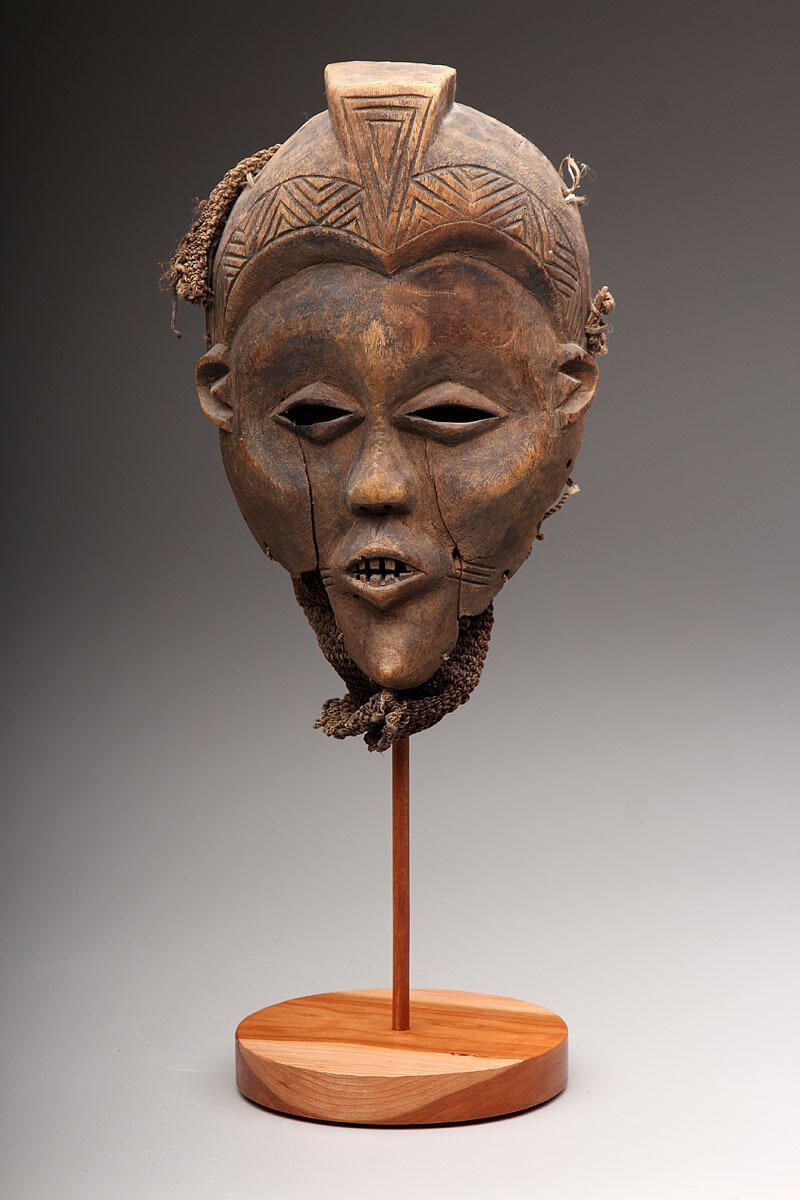 Carved wood face mask with broad face, slit eyes with heavy lids, and open mouth displaying teeth, topped with helmet-like feature and with a pierced perimeter from which is attachment woven plant fiber material.Collection