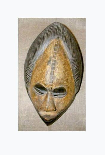 Medium wood face mask with high forehead, bisected by decorative line; slit eyes, large triangle nose, and protruding mouth; yellow-tan pigment on face; and with black stain across eye-area, over stylized hair, and around the mask's edge.Collection