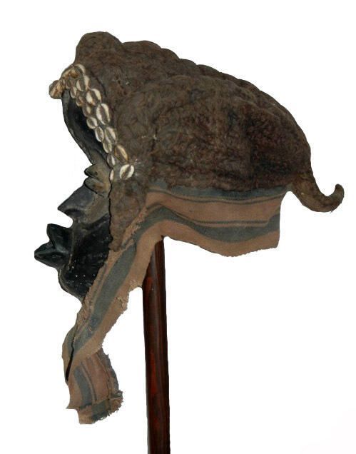 Carved wooden mask with high forehead outlined with cowrie shells, raised eyebrows, and strongly protruding mouth; equipped with fabric lining the bottom of an elaborate woven fiber wigCollection