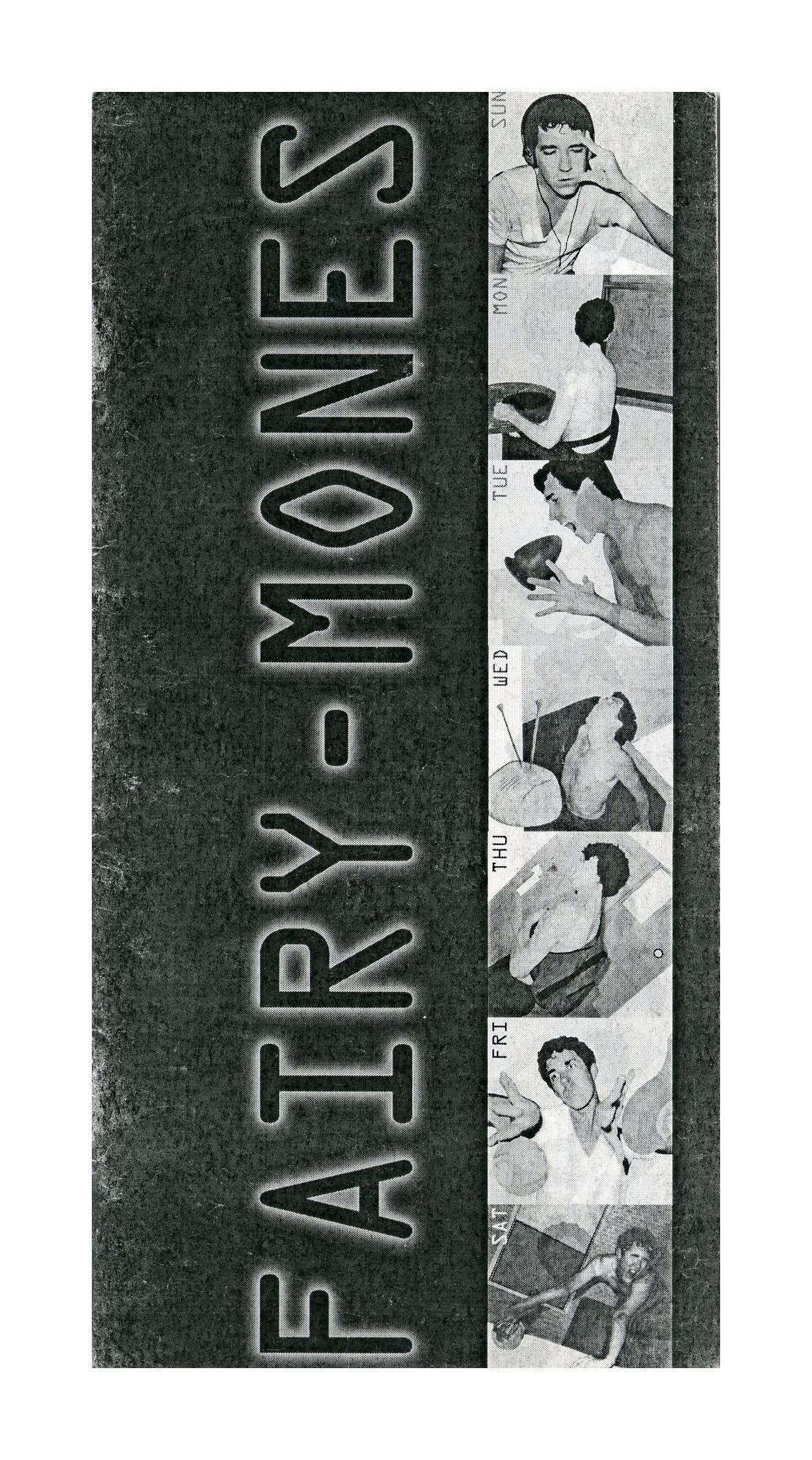 Small black and white paper booklet (longer along the vertical side) showing a column series of photographs of a young mans's week on the right side with week days visible on the top left corner of each photograph. On the left side on a black background is the title in black letters with a faint white halo around them.Collection