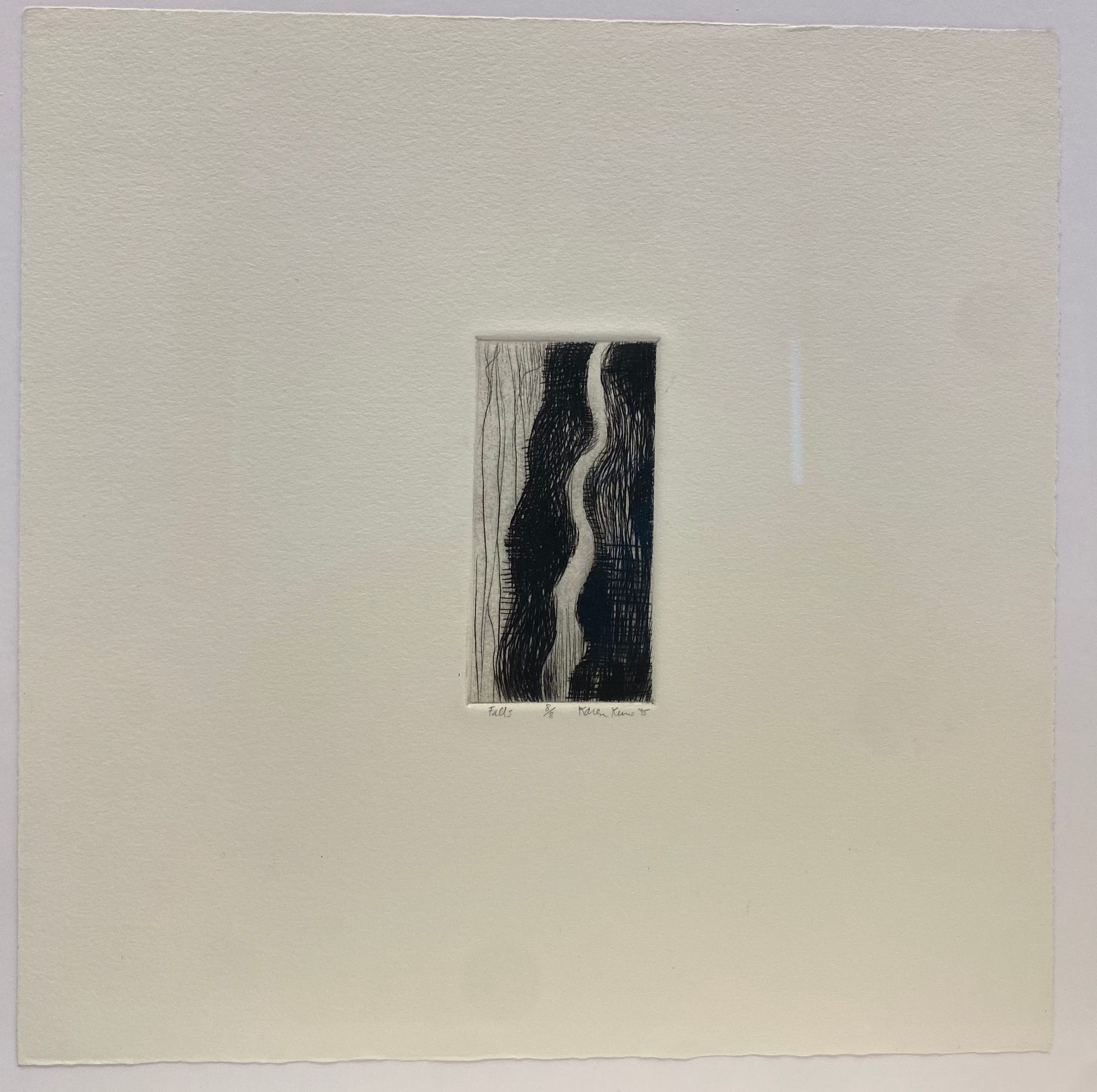 Medium-sized vertically oriented drypoint print of abstracted flowing waterfall centered and pressed into cotton rag paper with deckled edges.