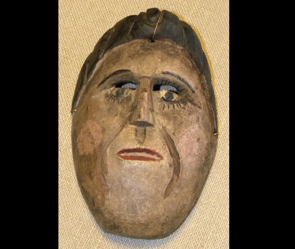 A long, oval-shaped wood mask depicting a woman with black hair styled with a front knot. Painted brown eyes with black eyelashes and cutout eyeholes for the wearer above. Thin black eyebrows with incised worry lines. A small, convex nose is above a small red mouth. Faded flamingo-pink blush circles on the cheeks flank deeply carved smile lines. A copper wire is attached to the back of the mask. There are overall scratches and very faded paint.Context