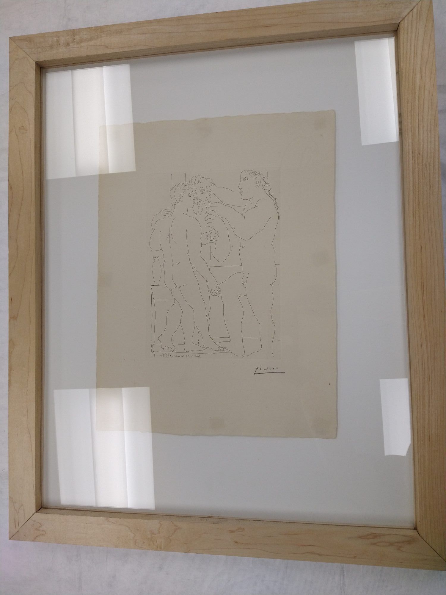 Medium artwork of three nude men standing and facing each other. Behind the far left figure is an outline of a table with a vase sitting on it. The far-right figure is wearing a vine headband that drapes down his back. Two outer figures are facing each other, while the middle figure is facing straight on. The print is displayed in a wood frame.