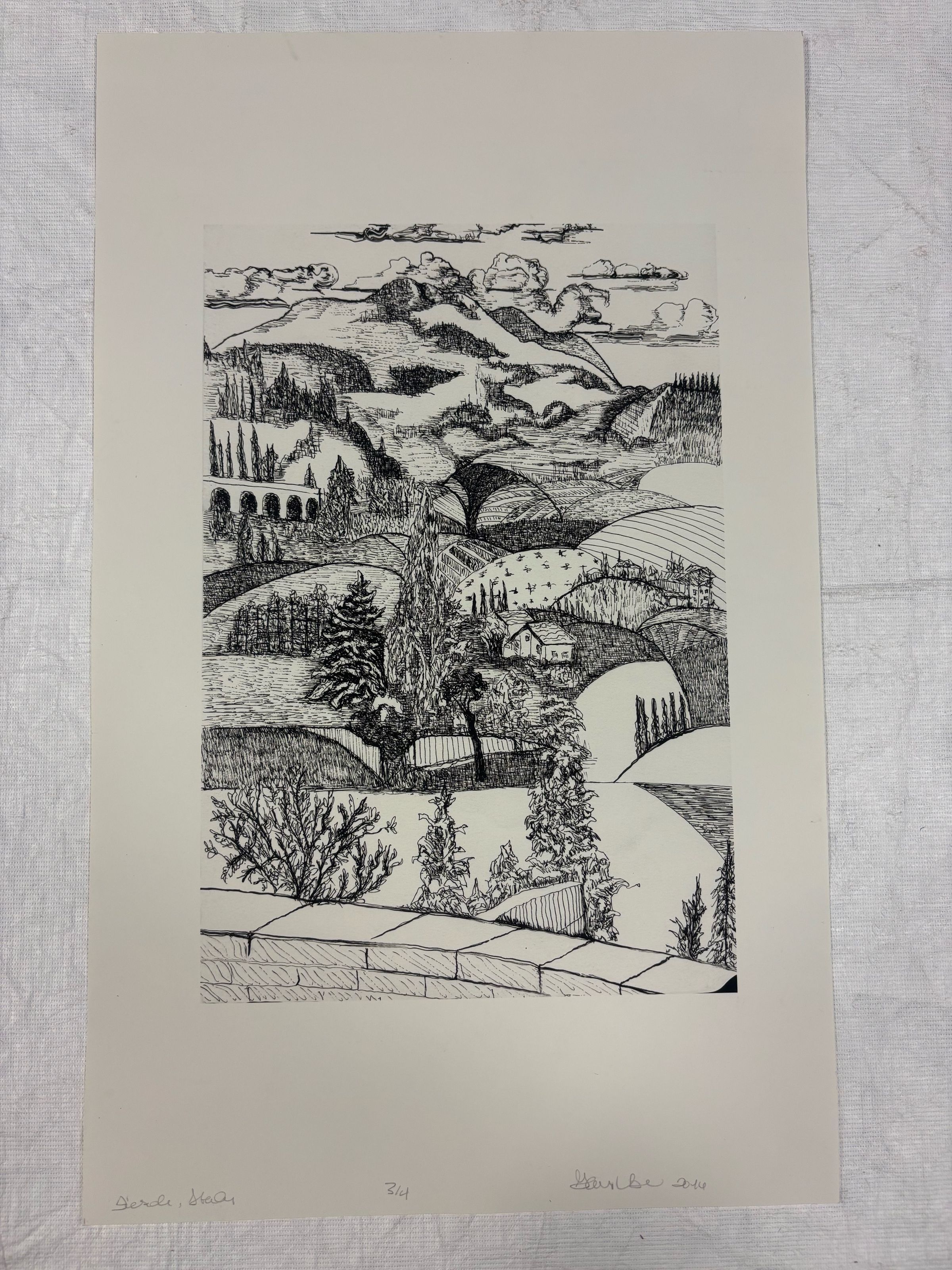 Medium, rectangular, vertically-oriented print depicting a landscape of a small mountainous rural town. At the bottom are brick walls, moving up hills are shaded with various techniques, a little house and bridge can be seen around the middle section, and clouds at the top. Different species of trees are depicted and overlapping hills create the composition.Collection