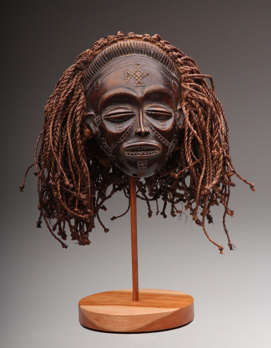 Medium wood face mask with incised scarification, slit eyes, carved teeth, and braided fiber wig.Collection