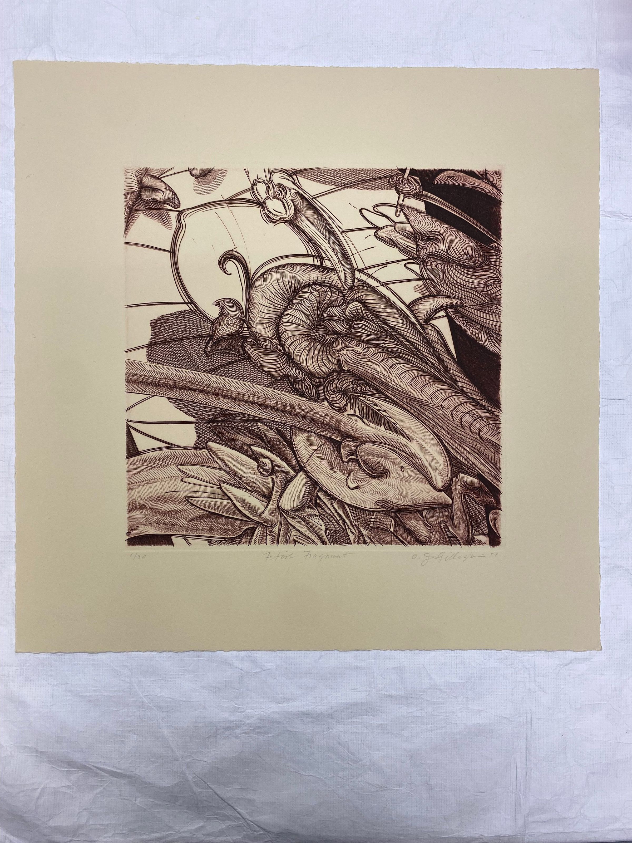 Large vertically oriented etching of a fetish object's feather textured surface with curved lines and red-brown pigments against cream-colored cotton rag paper with deckled edges.Collection
