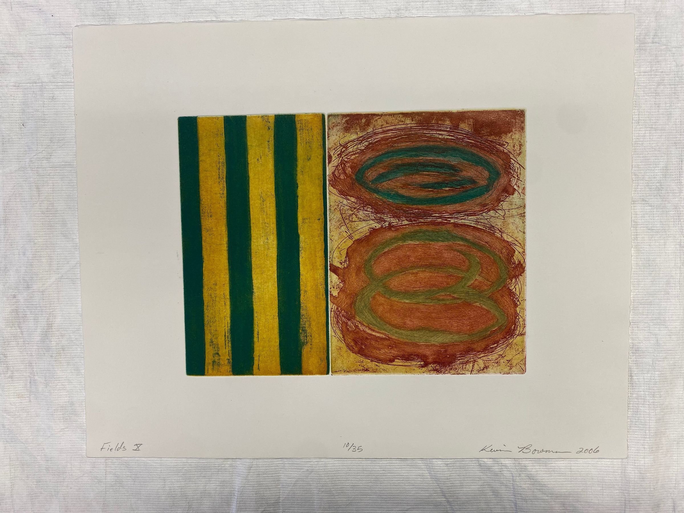 Medium-sized multi-plate etching of abstract imagery horizontally oriented. On the right, there are alternating green and yellow stripes, and on the left, there are green ovular shapes stacked with some overlapping against a red rust background.Collection