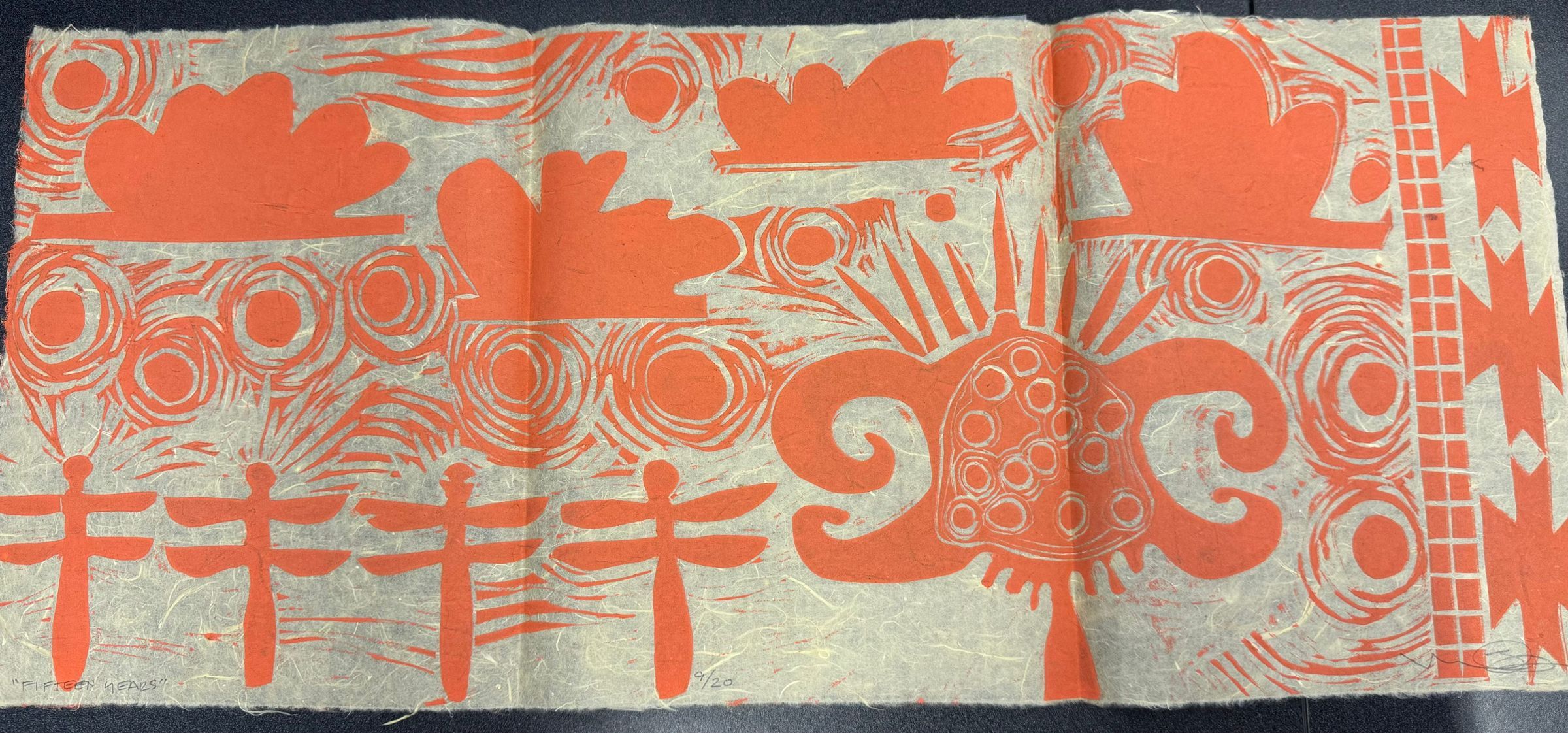 A long horizontal rectangular print on natural paper with orange shapes of natural motifs.Context