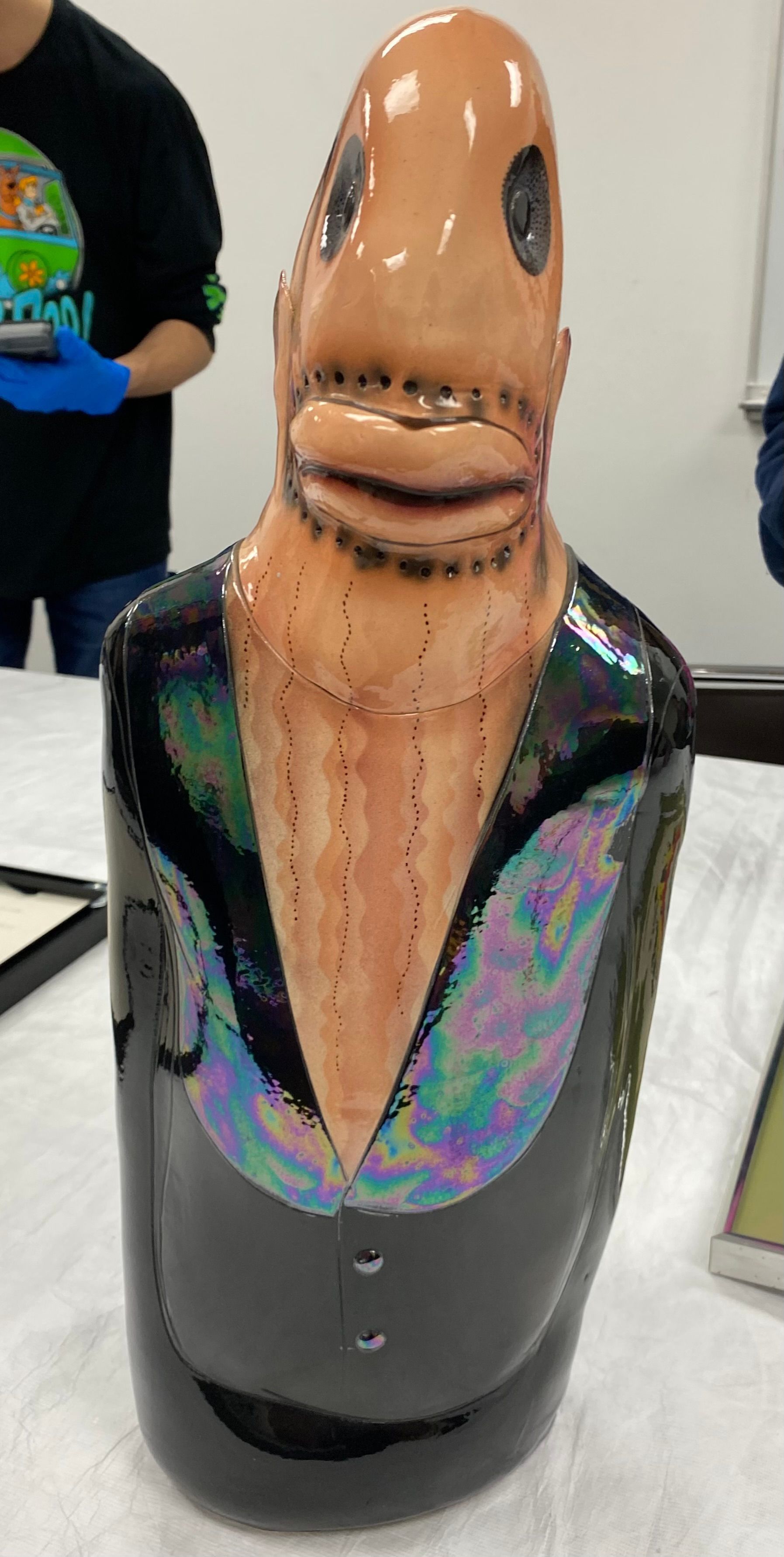 Medium-sized sculpture of an anthropomorphic salmon-colored fishman in a black tuxedo utilizing various slips, glazes, and airbrushing techniques as well as incising to create illusionistic textures.Collection