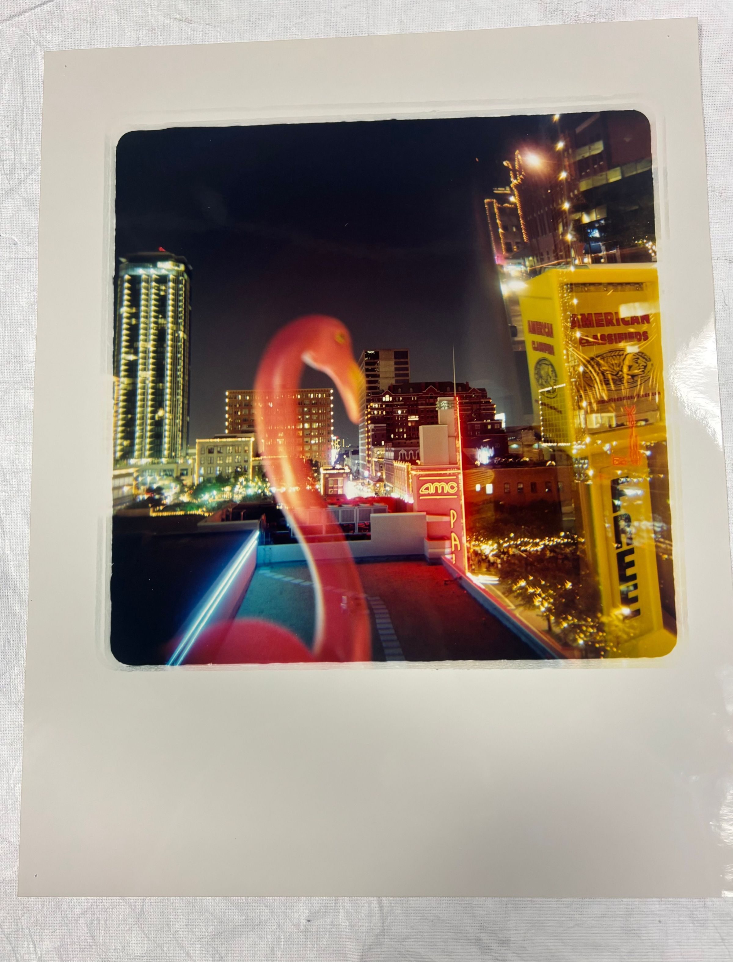 Large, rectangular, vertically oriented photographic print in glossy color featuring a pink plastic flamingo on a rooftop looking away at the cityscape in the background. The large yellow post on its right reads “American Classified”.Context