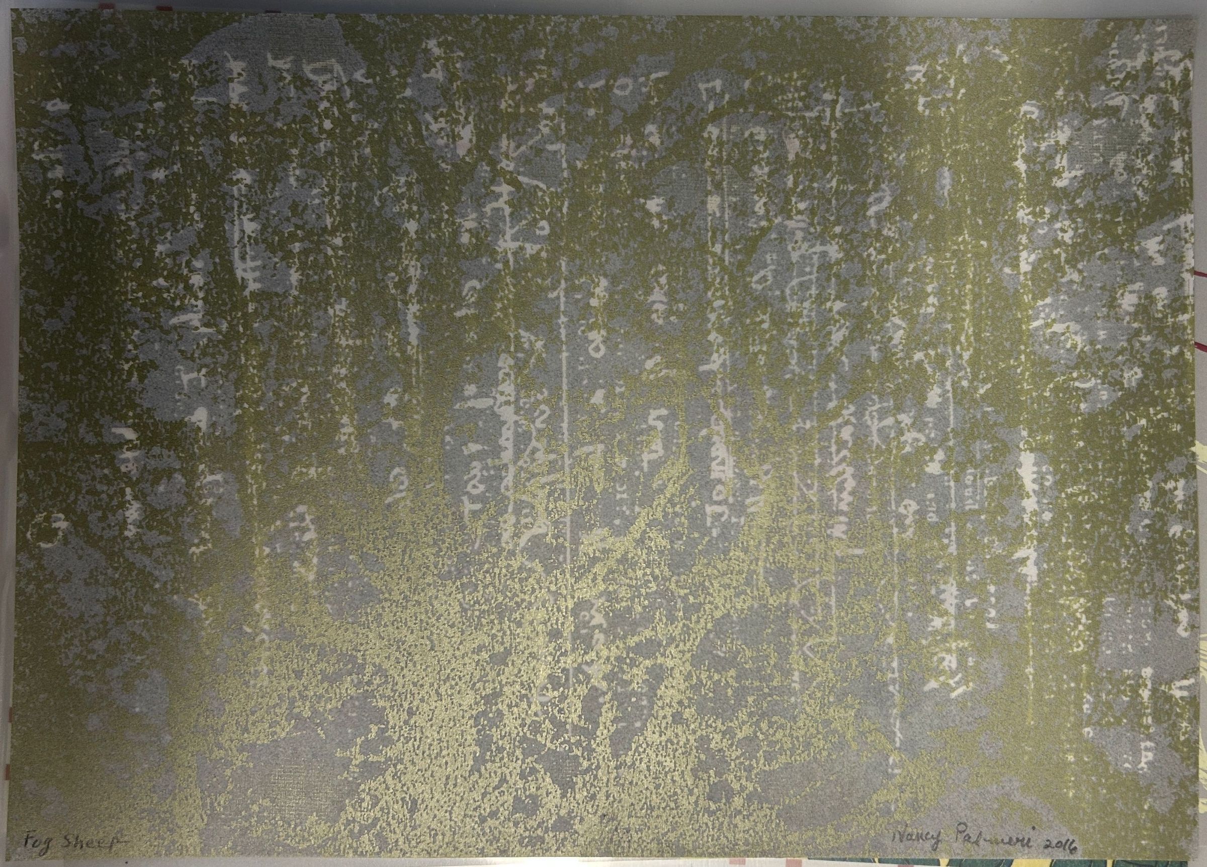 a small abstract print of cursive text under a layer of organic and fluid lines.Collection