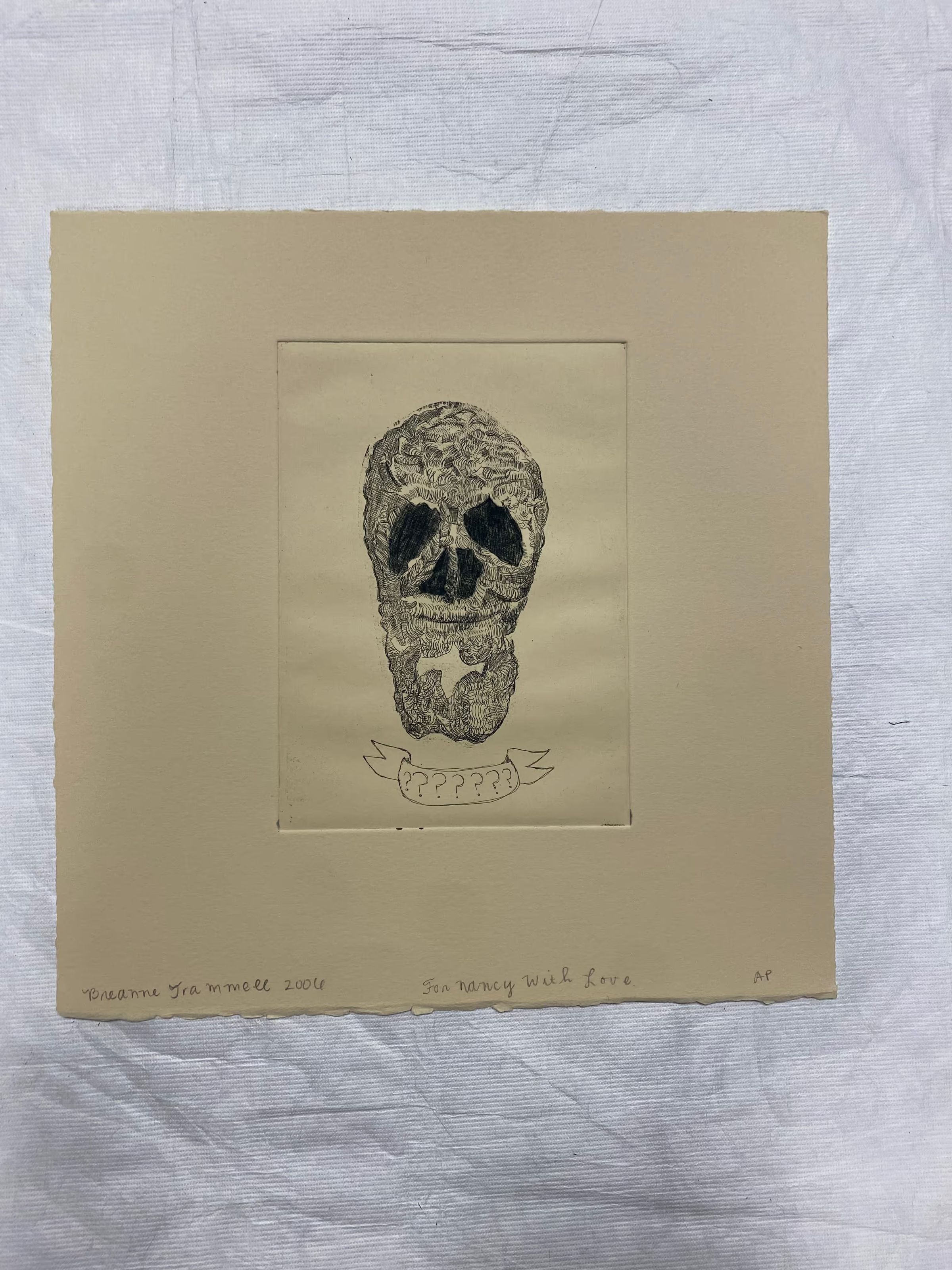 Medium sized etching of a centrally placed skull like head made up of curved as well as thatched lines with blacked out nose and eye holes. There is a banner with seven question marks beneath the skull.Collection