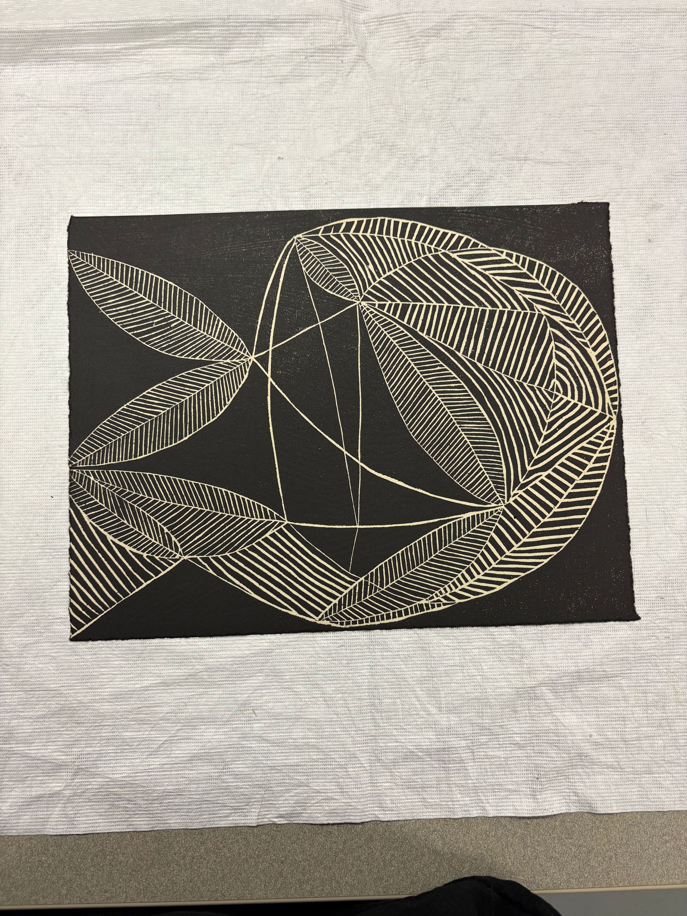 A horizontally oriented, medium-sized print that is primarily black in color. The relief print has organic leaf like patterns that are made of cream colored lines that move throughout the plane of the print.Collection