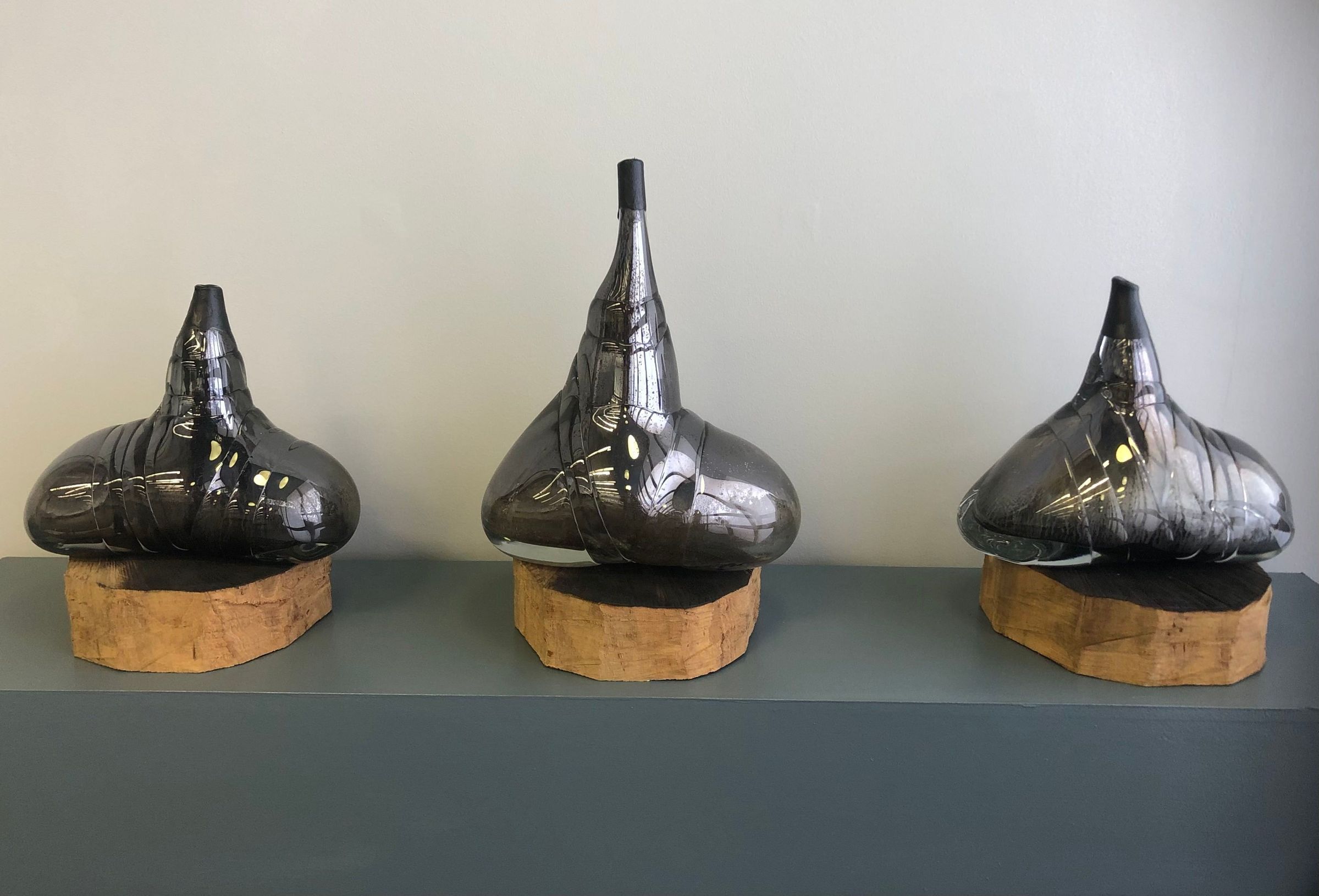 A mirrored glass sculpture forming a slight submarine shape with a matte black spout hole at the central top. It sits on a wood base with a blackened top and is part of a set of three. It is more symmetric than its companions.Collection