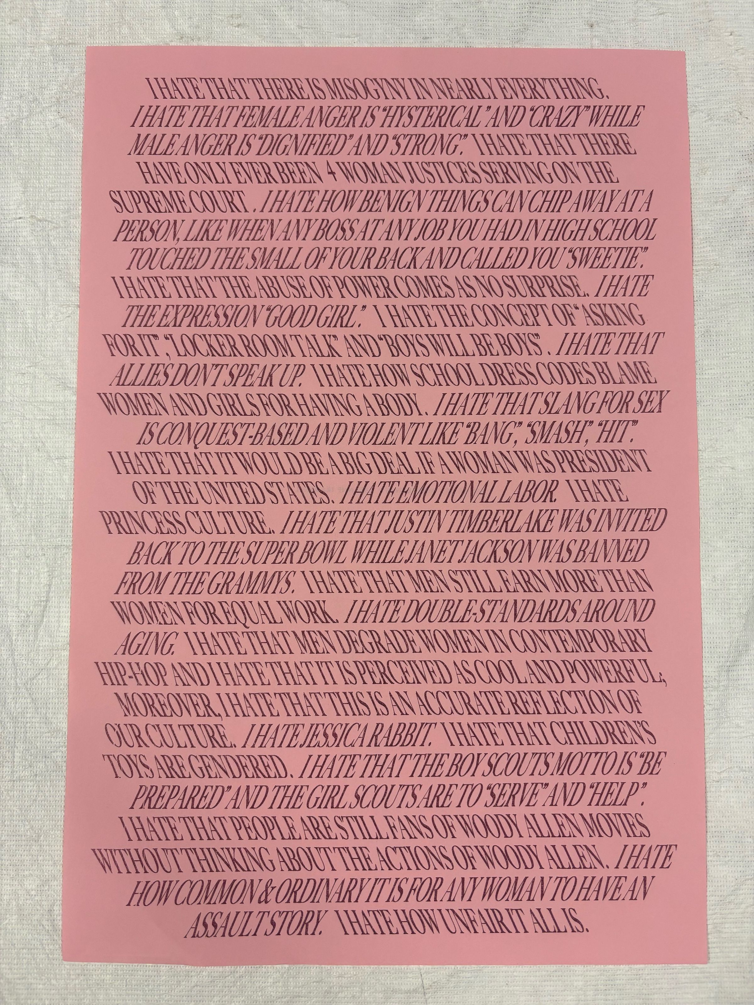 Small, rectangular, vertically-oriented print depicting a page of sentences venting out the frustration and anger towards the misogyny and unfair treatment women face. The print is on pink paper and the type is magenta, italicized, and alternates with each sentence the direction of the slant.Collection