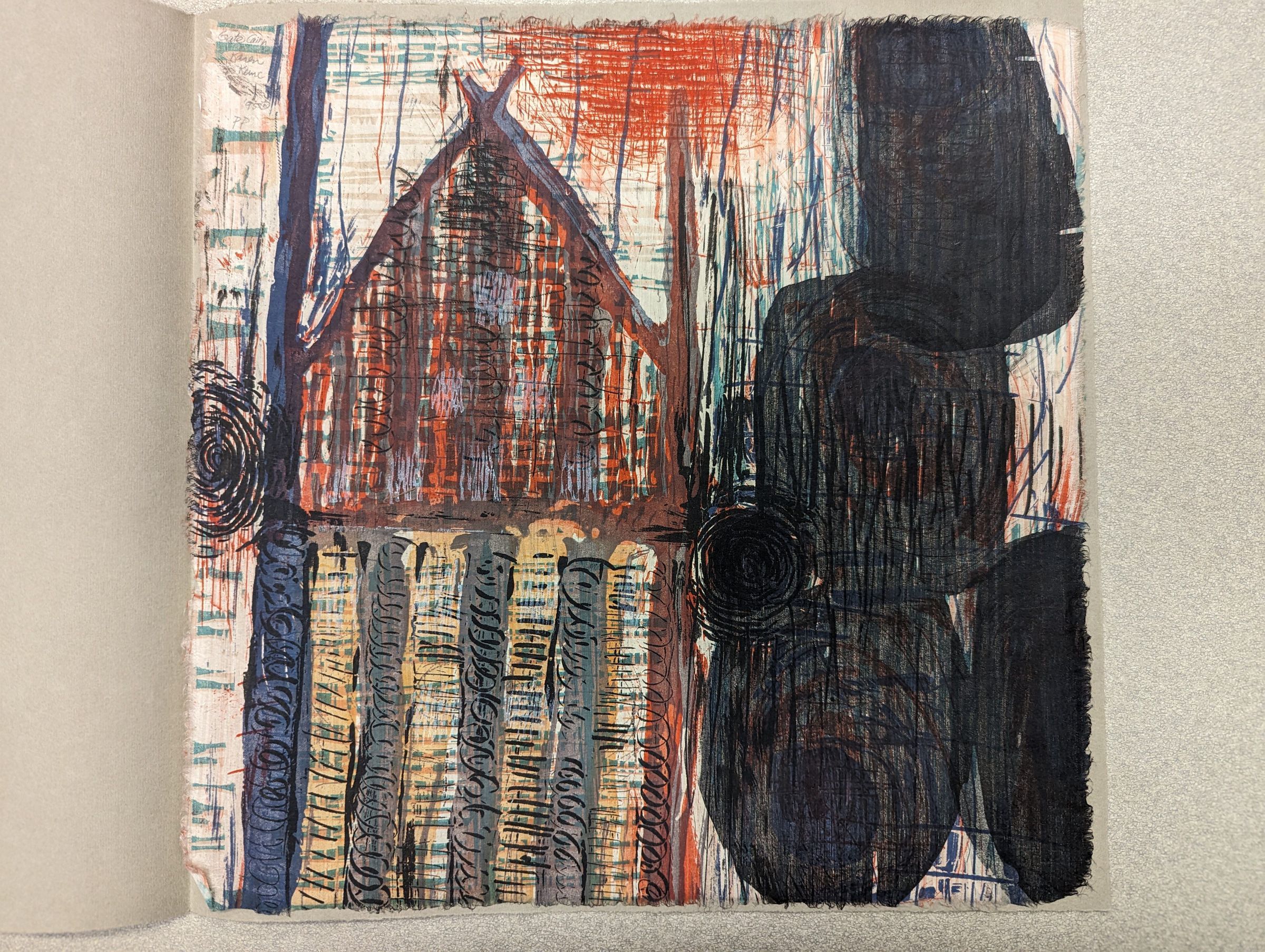 A square print showing a very abstracted image of a building made out of red and blue beams with a pointed roof. Sharp black squiggles run up the beams, and beside the house sit great blobs of black pigment. The background is sketchy and pale with a red sun above. The print is kept in a long page of folded grey paper with the title printed on the front.Context