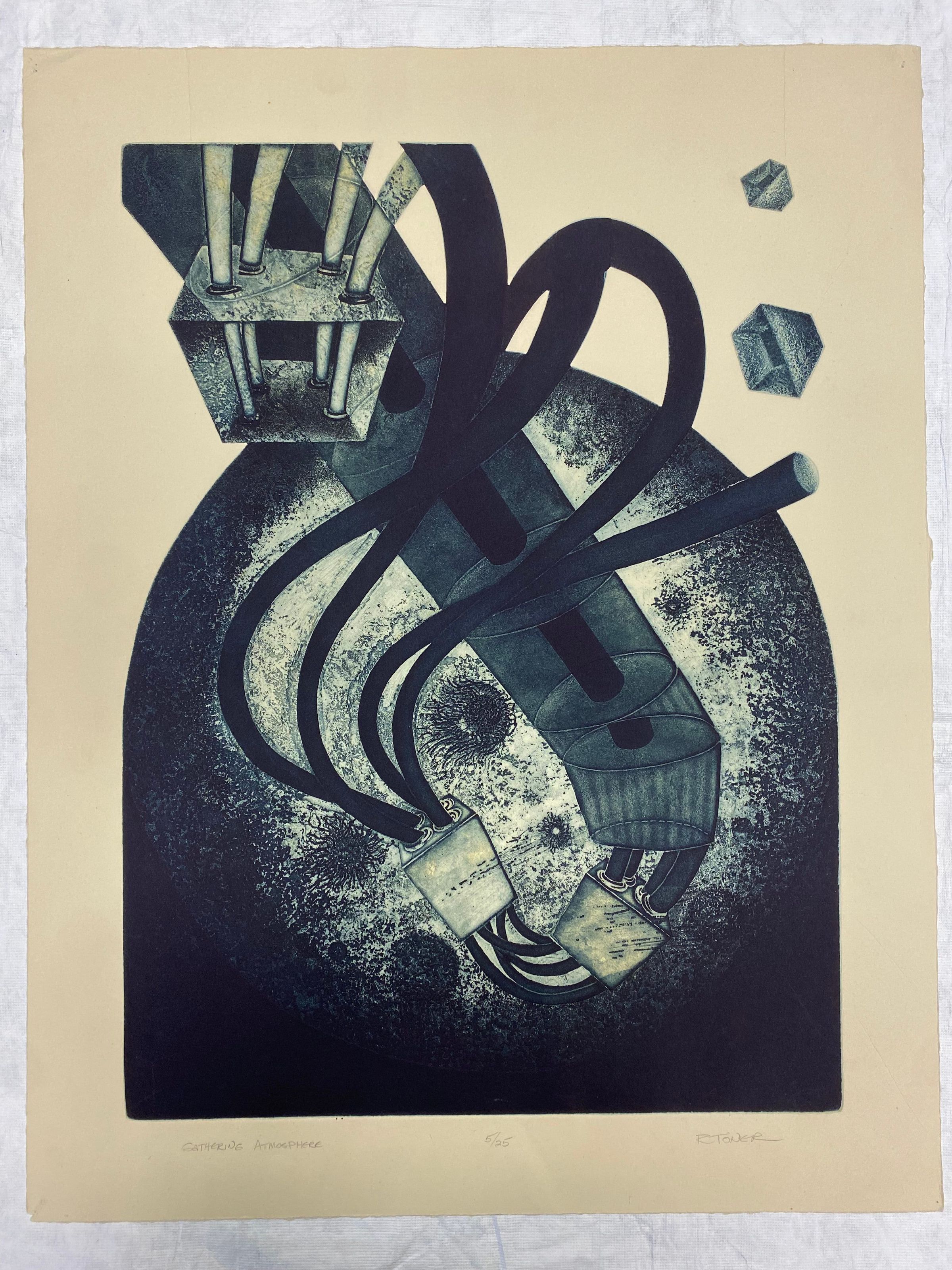 Large vertical print depicting a mechanical device with long flexible tubes protruding from with urchin-like creatures floating around it in the bottom region of the print and two small boxes floating in the top left region.Collection
