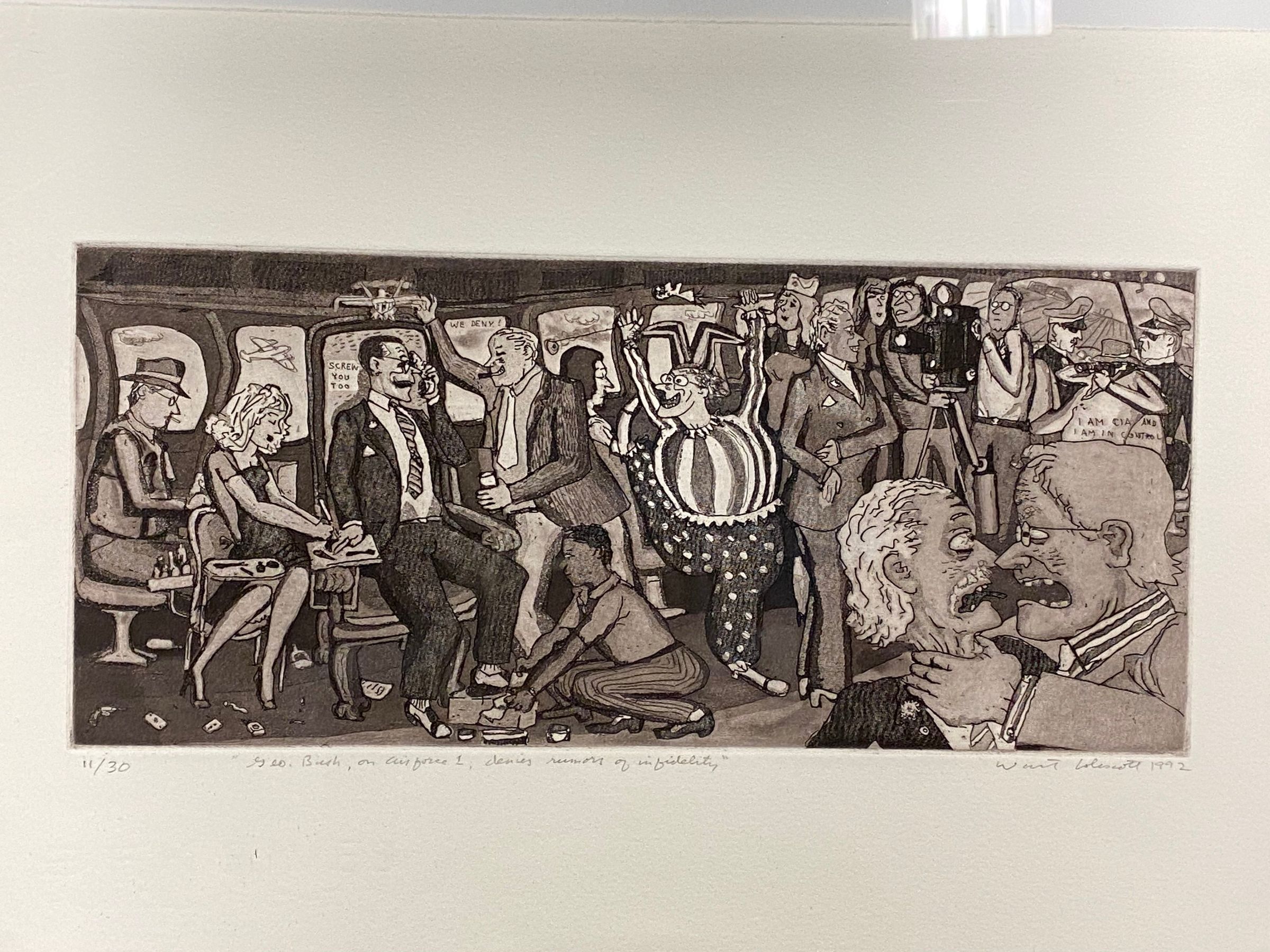 Medium-sized intaglio print horizontally oriented with black, grey, and white tones on cotton rag paper. This multi-figural composition reads from right to left proper, with most of the action occurring on the right of the scene. In the foreground left corner proper, two men are fighting. Behind them, a collection of figures are positioned in the middle ground, both seated and standing.