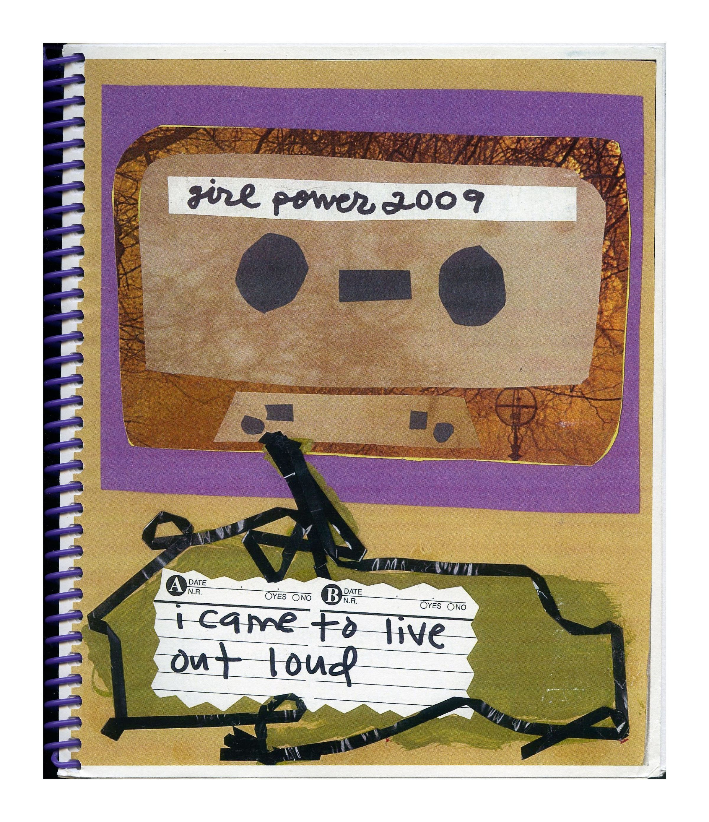 Small white paper booklet with a collage of paper paint and cassette tape film. A medium brown paper cassette tape is set on a purple background with the title across it on a white strip, and attached at the bottom we see film surrounding a smaller collage of lined paper on a green paint background.Collection