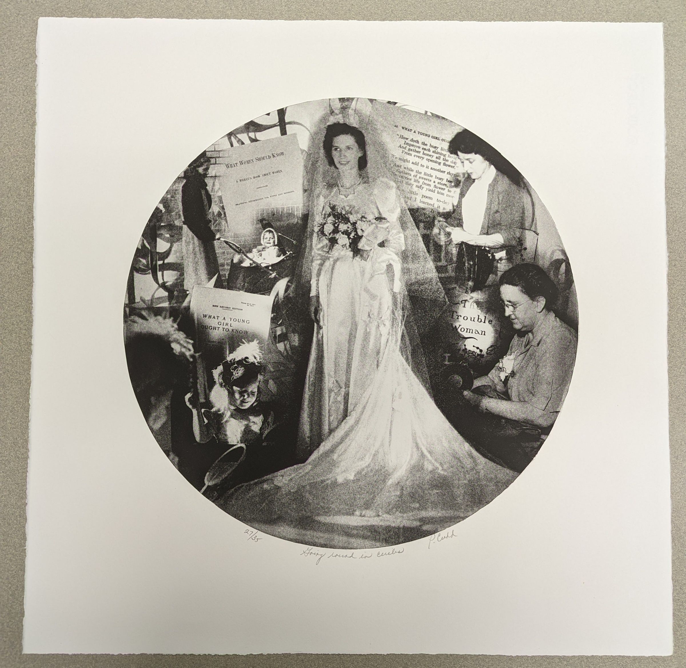 A large black and white print on deckle edged paper. Within a circle in the center of the page is a collage of scenes, centered around a dark-haired woman holding a bouquet and wearing a wedding dress. Around her are four portraits (a baby, a girl, an adult woman, an older woman) engaged in some activity; interposed between them are pages from books alternately titled "What Women Should Know," "What a Young Girl Ought to Know," and "The Trouble Woman."Context