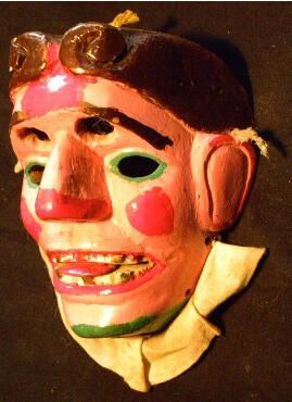 A life-sized triangular wood mask depicting a comical man with a rose-pink complexion and red blush accents on the forehead, nose, large ears, and cheeks. The hair is parted, brown, and curled Slanted brown eyebrows are over two sets of cutout eyeholes, one outlined with green. A straight nose is above an open red mouth showing two rows of white and gold teeth and a protruding red tongue. A white fabric collar is under the green chin. A wire and rope are attached to the back of the mask. The cloth is detaching, and the paint is cracking.Context